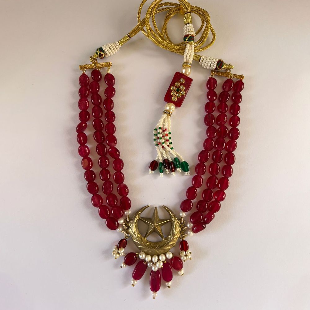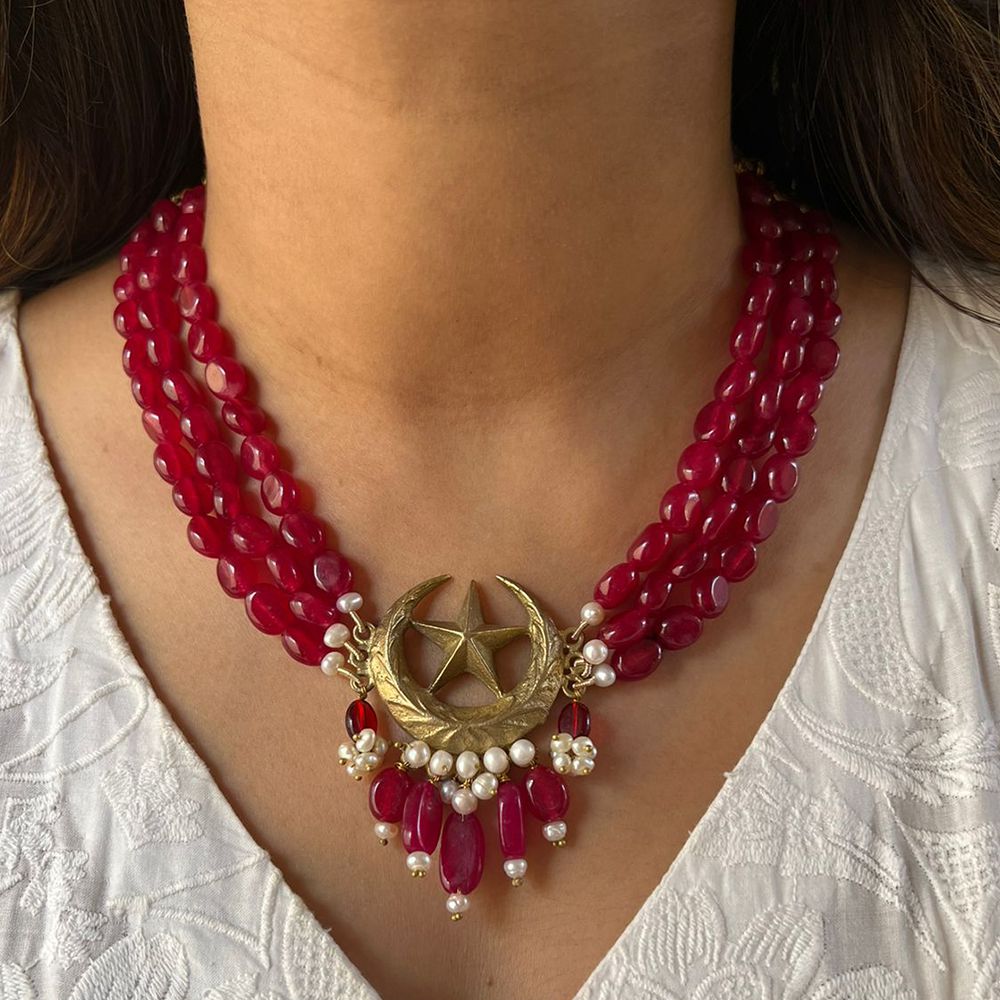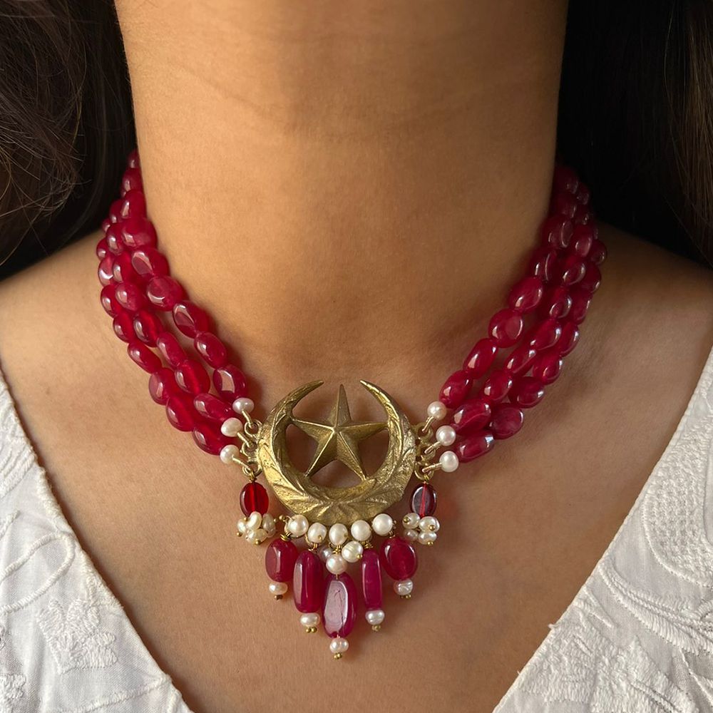 Made with semi precious Ruby and few Fuchsia stones. Lenghts are adjustable Can be worn as a necklace and choker. Comes in an AyeshAccessories’s gift box.