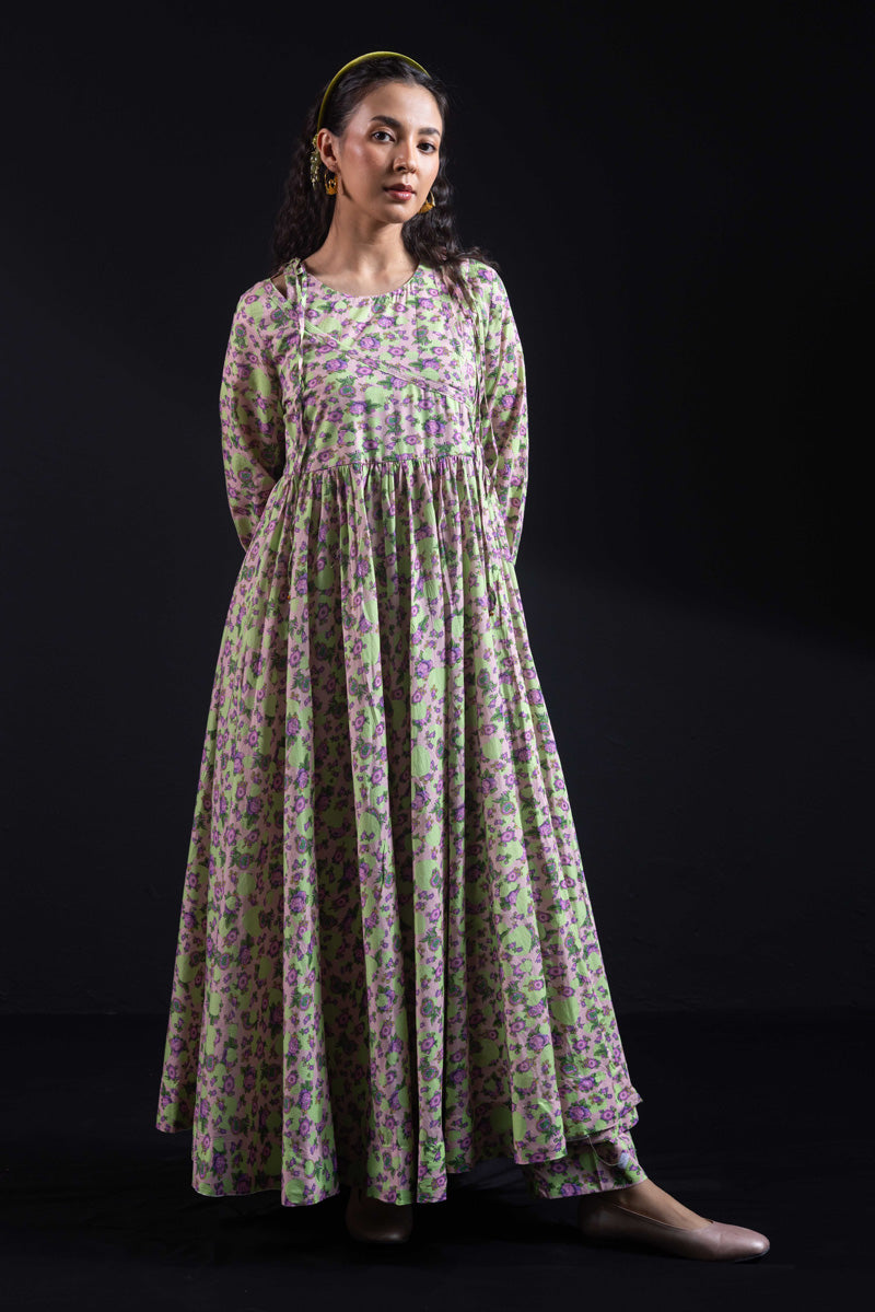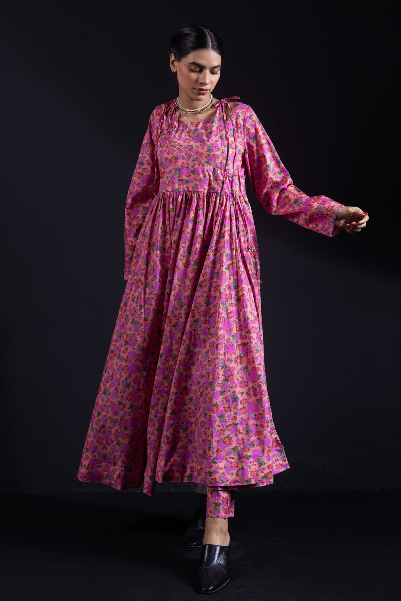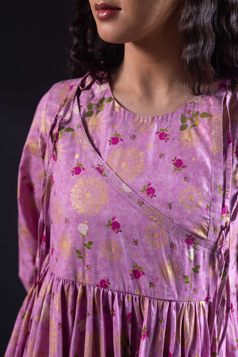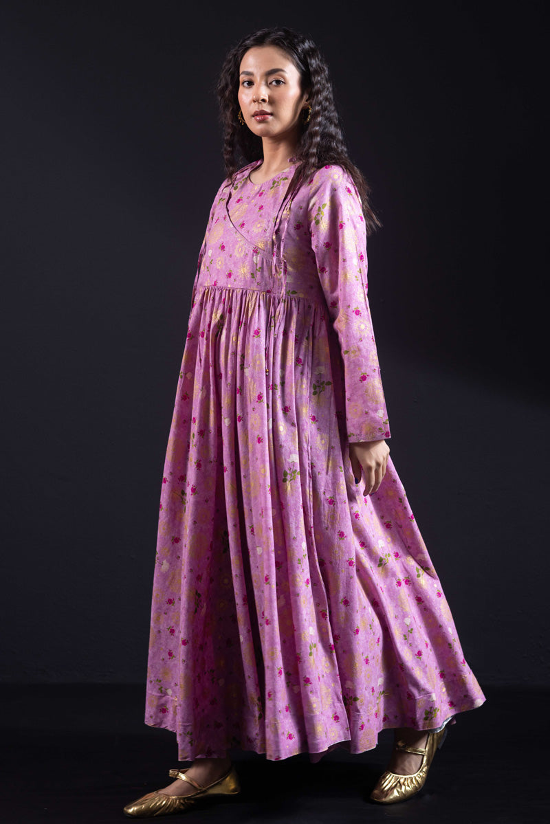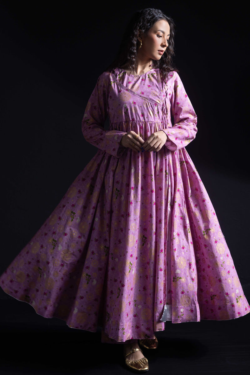 Angrakha style flared dress in luxurious gold print, with a fitted yoke, side slits, and tassel details. Gathers around the bodice create a flowing, dance-ready flare. Fitted sleeves with fine stitching on the bodice and hems. Paired with matching printed straight-fit trousers.