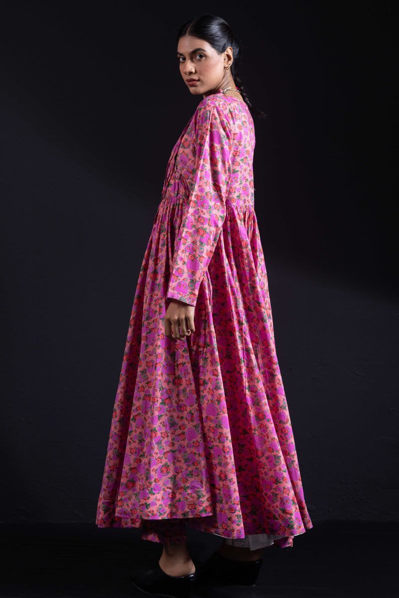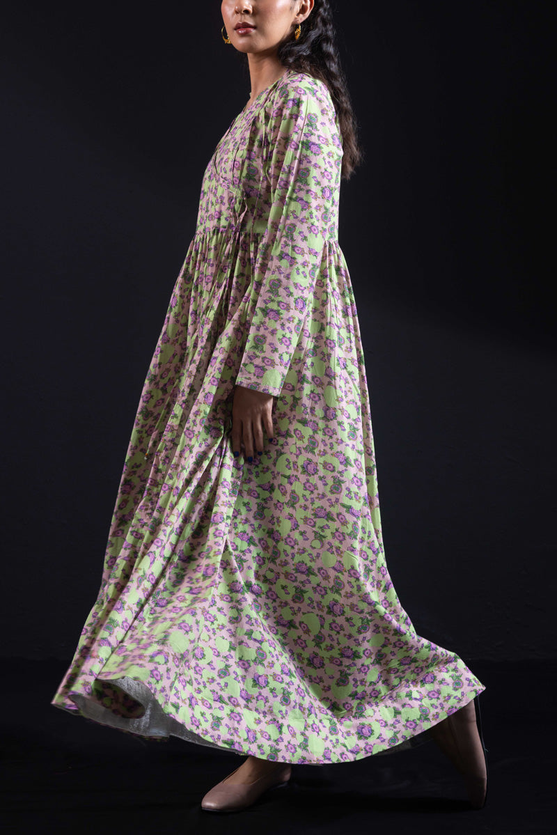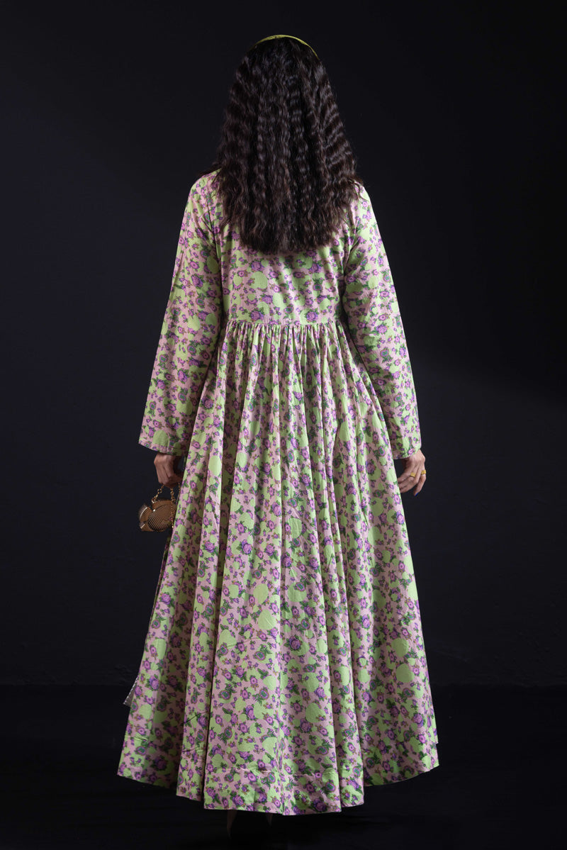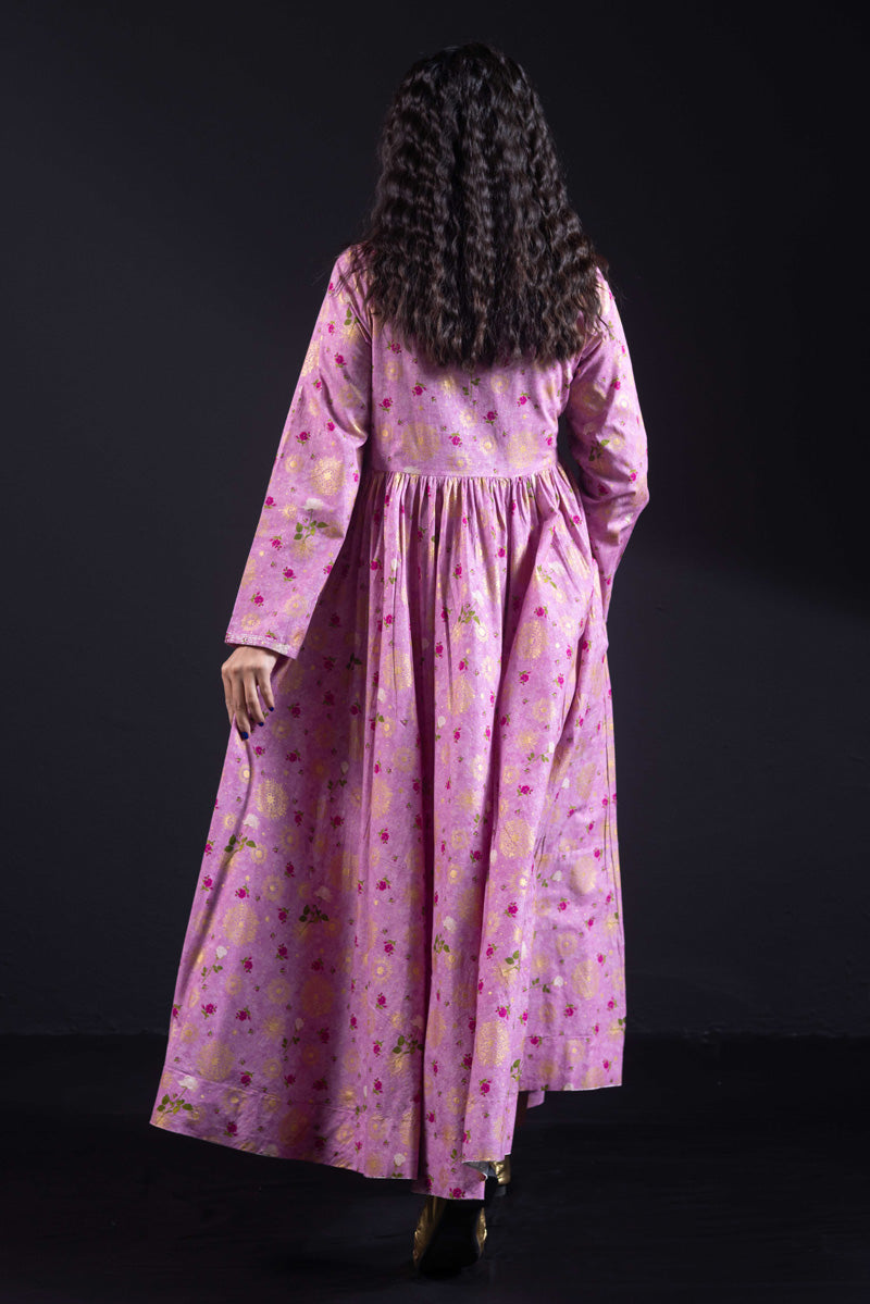 Angrakha style flared dress in luxurious gold print, with a fitted yoke, side slits, and tassel details. Gathers around the bodice create a flowing, dance-ready flare. Fitted sleeves with fine stitching on the bodice and hems. Paired with matching printed straight-fit trousers.
