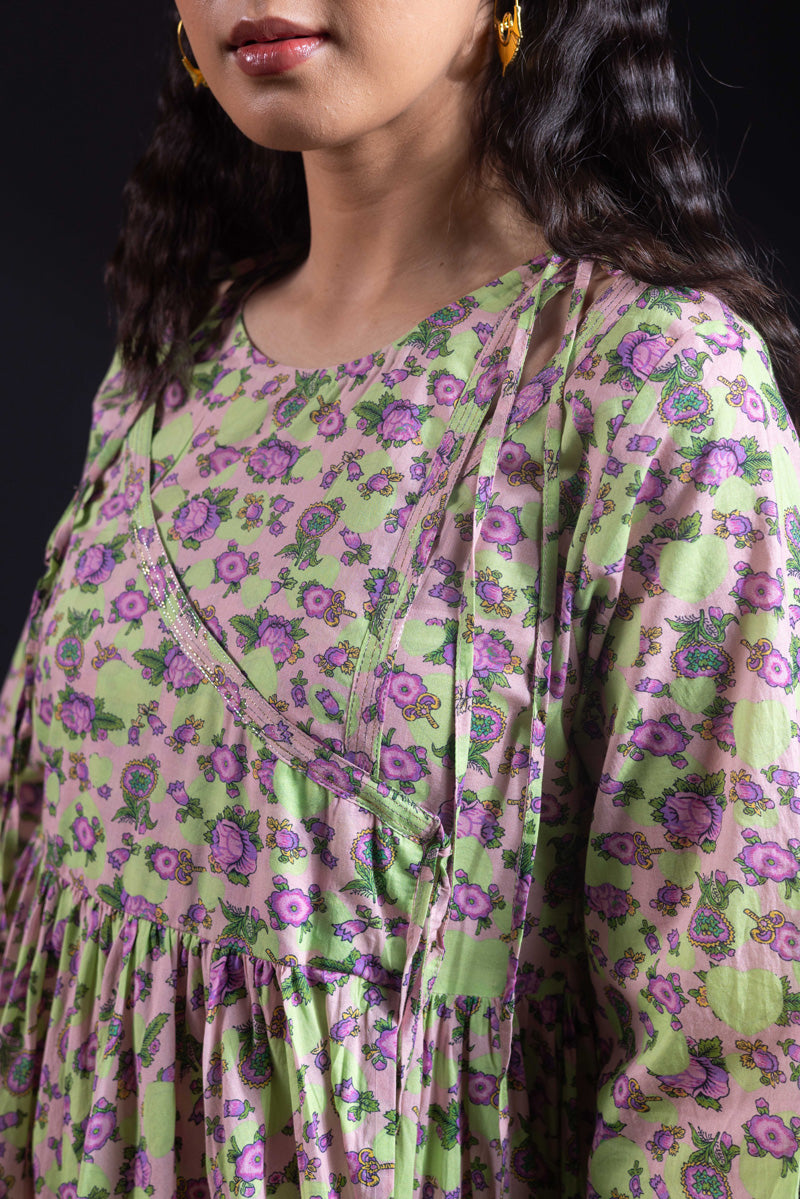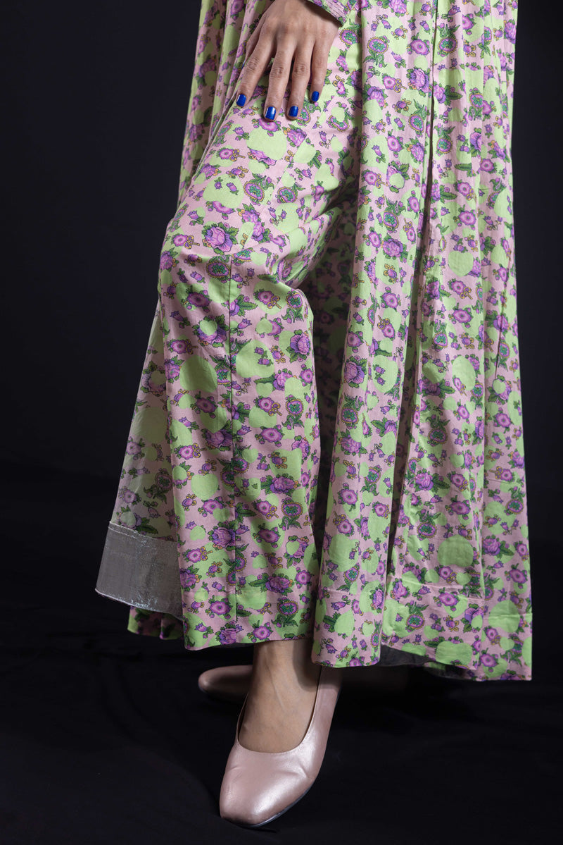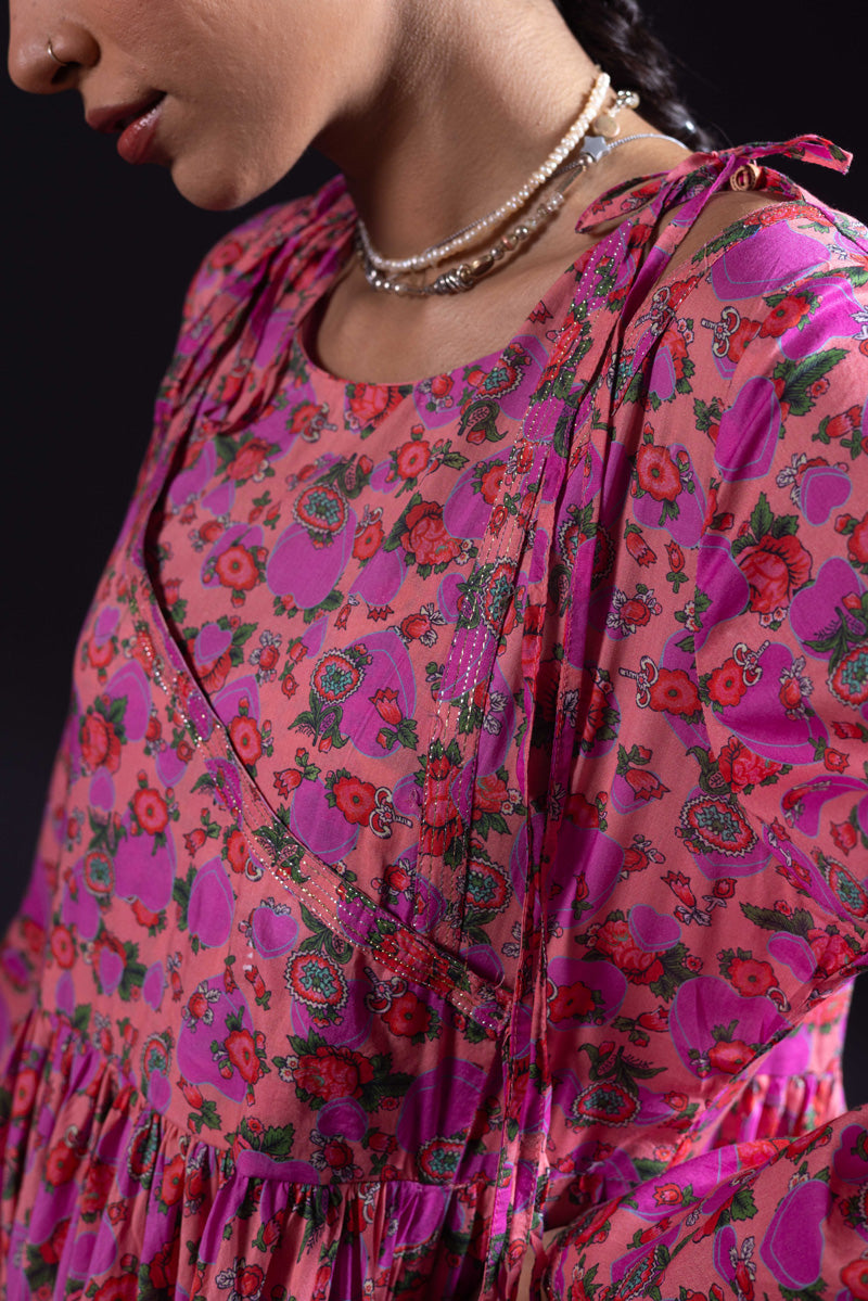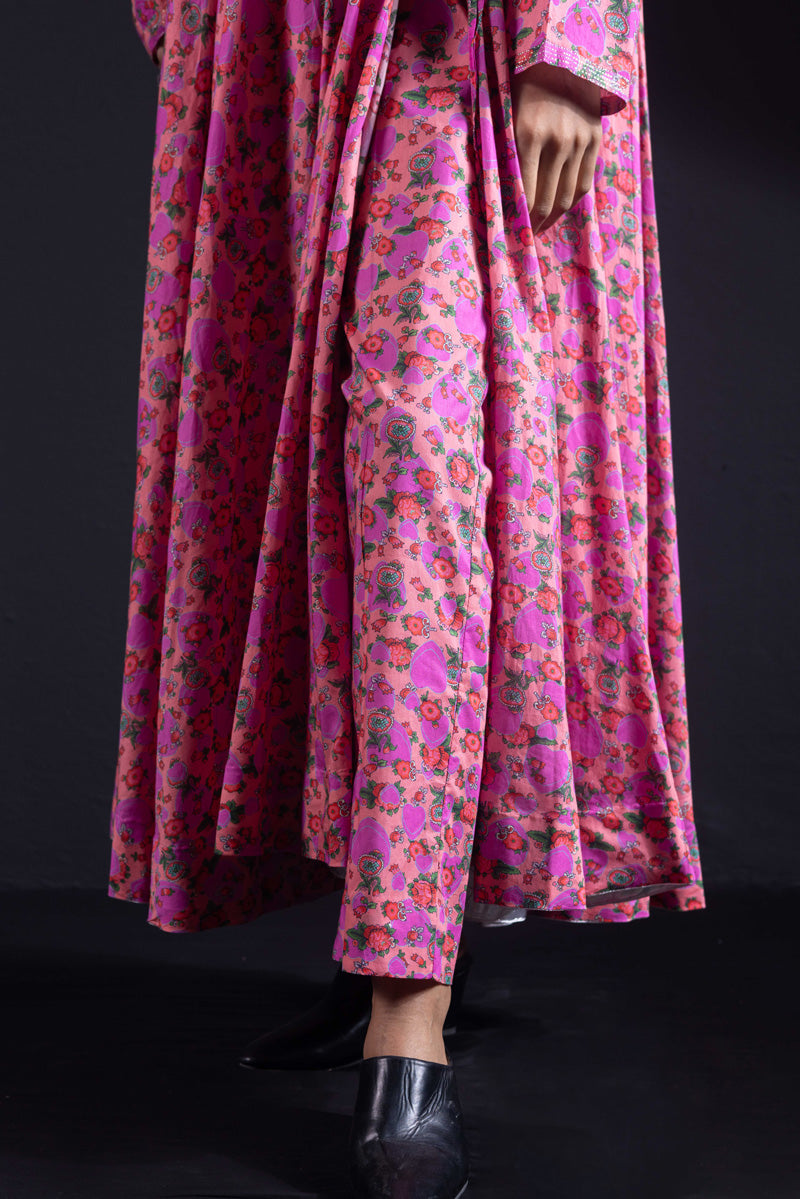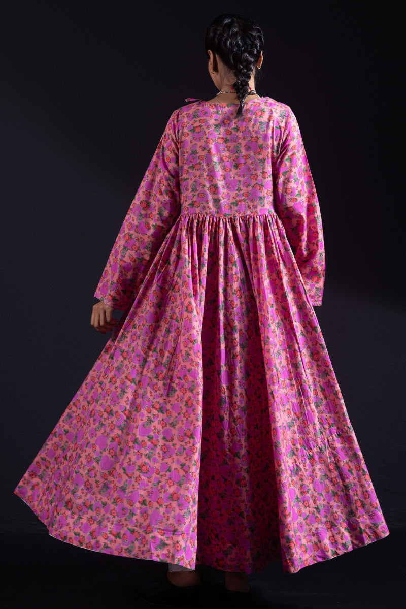 Angrakha style flared dress in luxurious gold print, with a fitted yoke, side slits, and tassel details. Gathers around the bodice create a flowing, dance-ready flare. Fitted sleeves with fine stitching on the bodice and hems. Paired with matching printed straight-fit trousers.