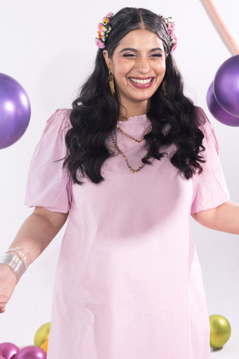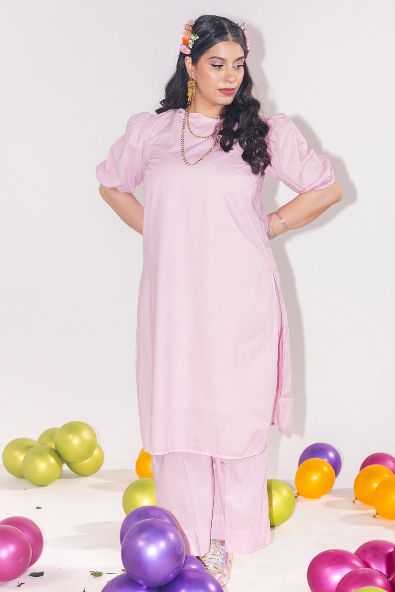 Classic-fit shirt with a shawl-collar neckline and half sleeves featuring exaggerated puff and cinched detailing. Rounded hem. Paired with matching culottes for a cohesive, stylish look.