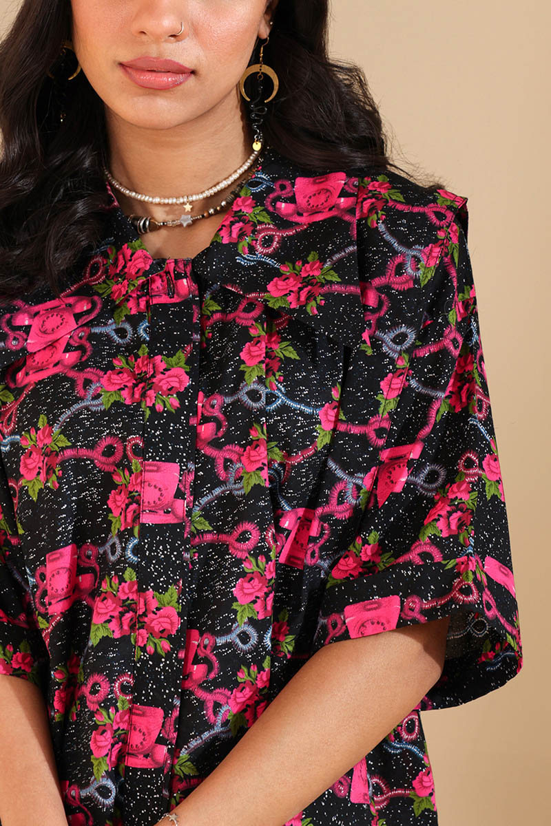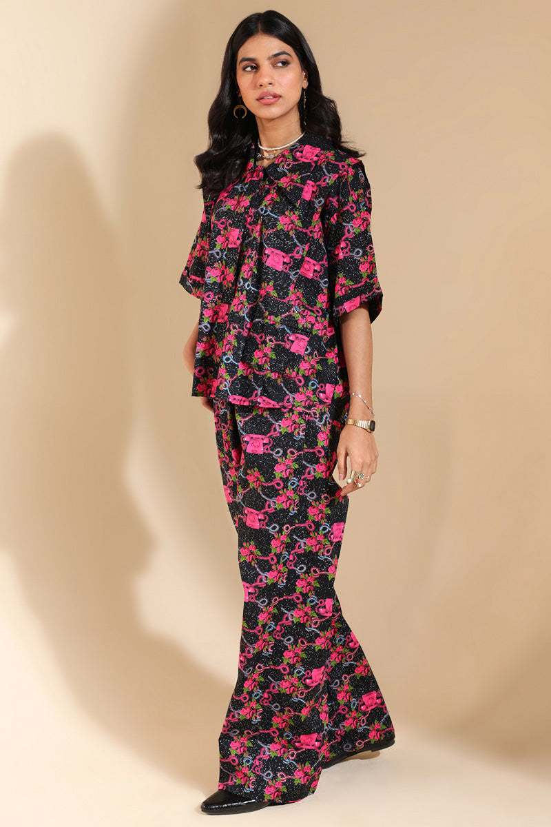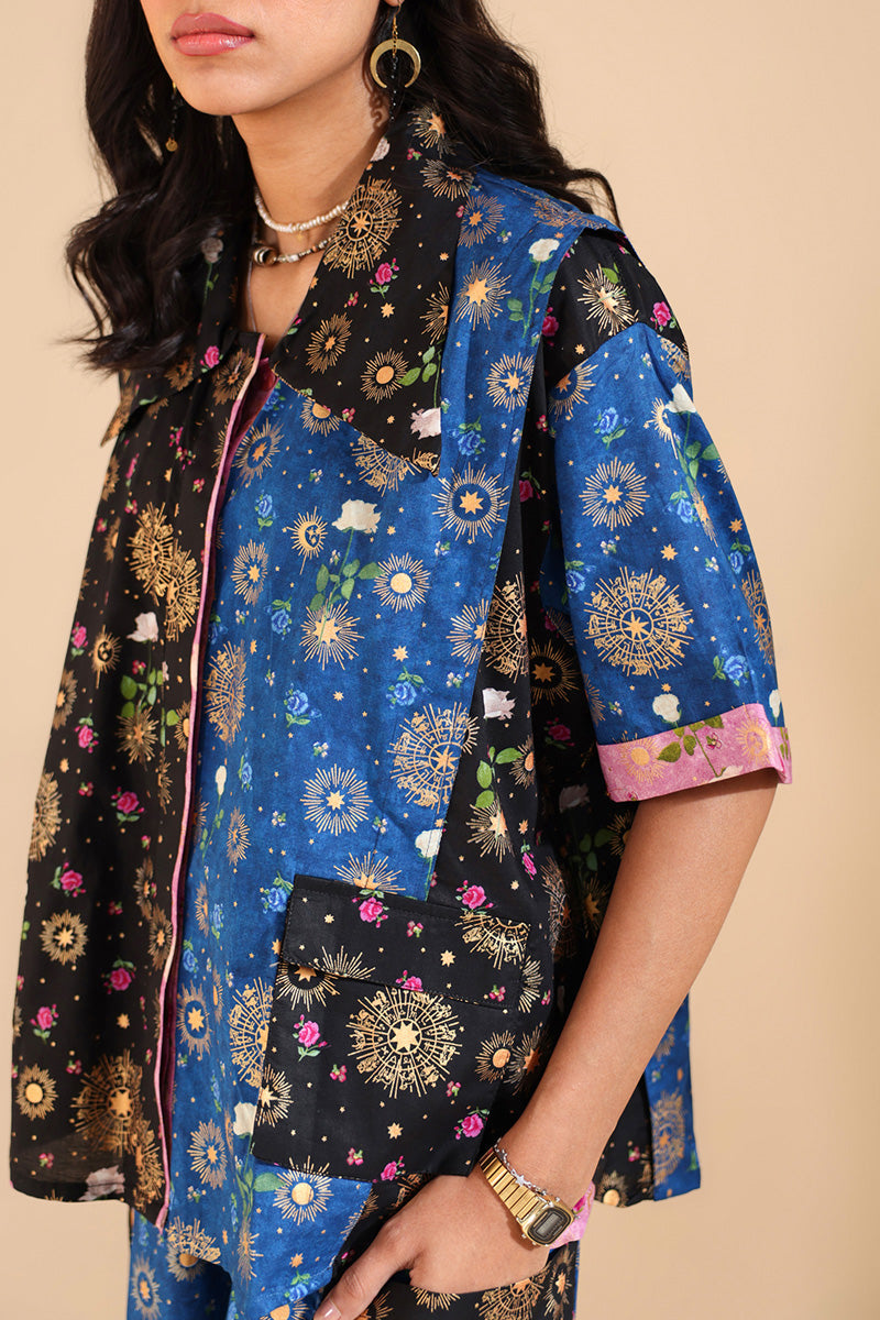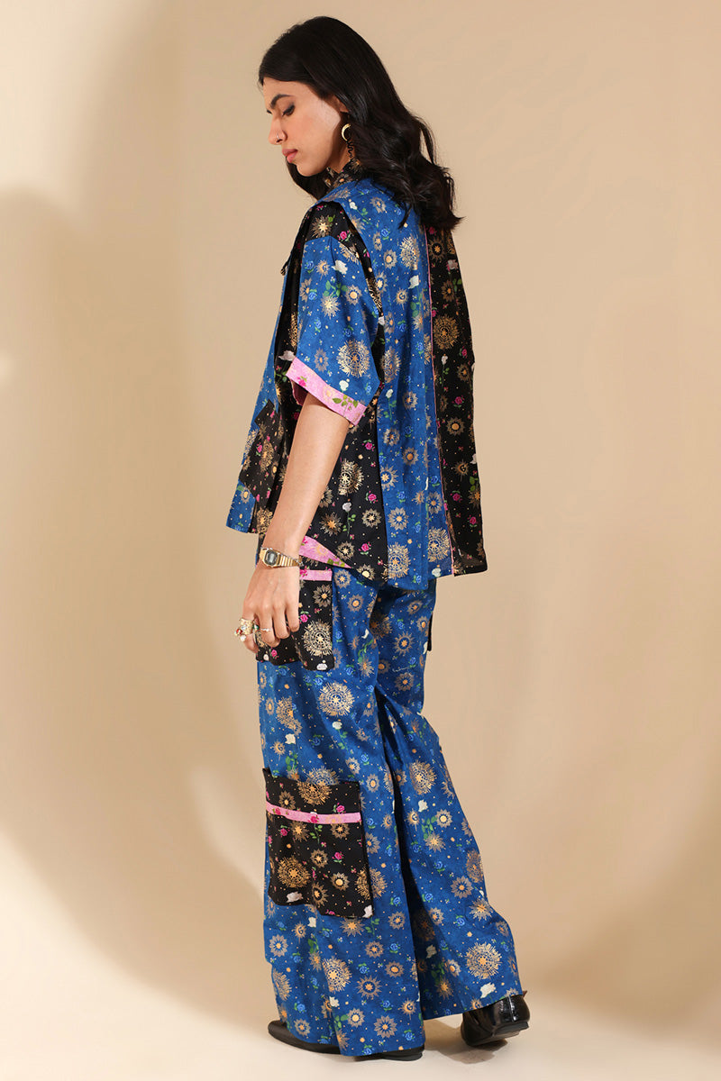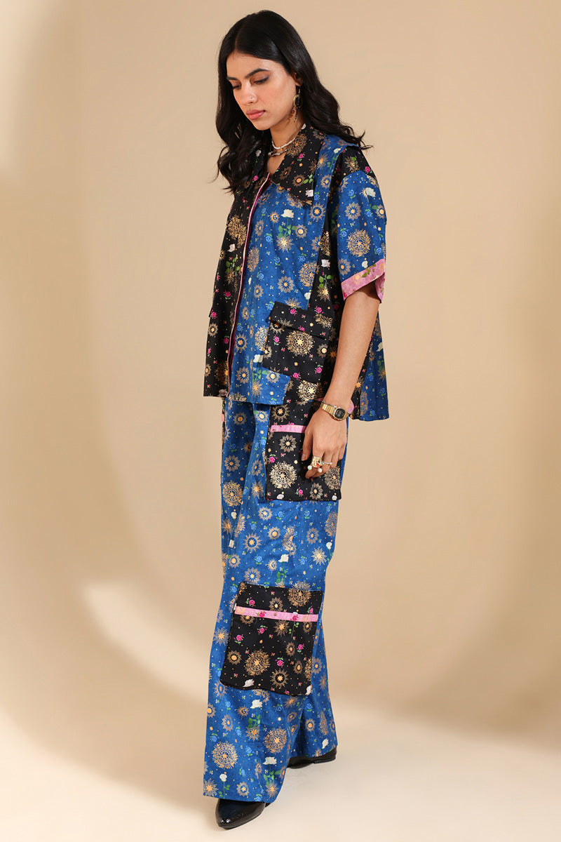 A luxurious gold-printed button-down collared shirt with front pockets and drop shoulders, paired with cargo pants featuring statement pocket details.