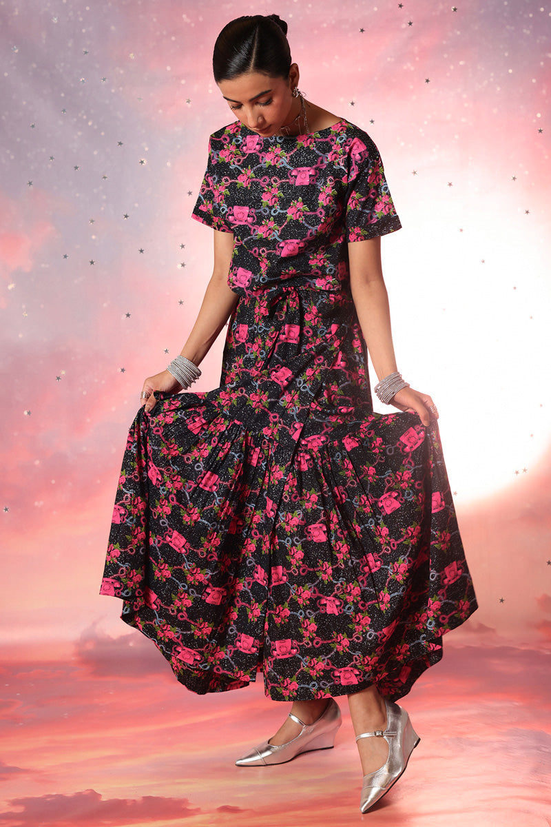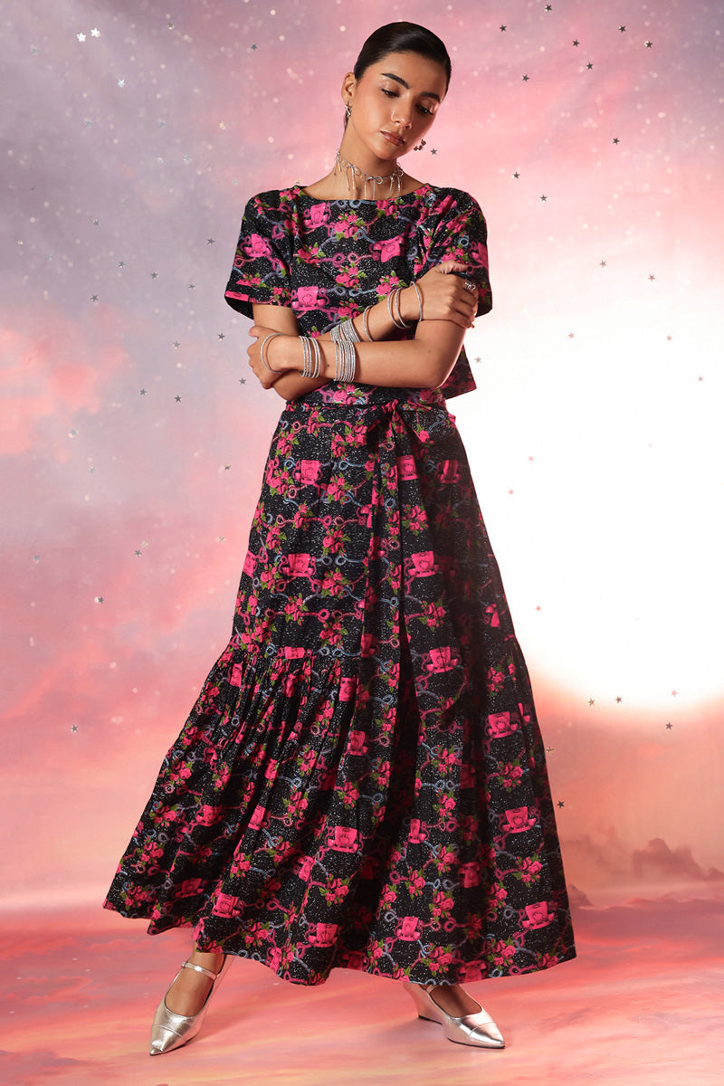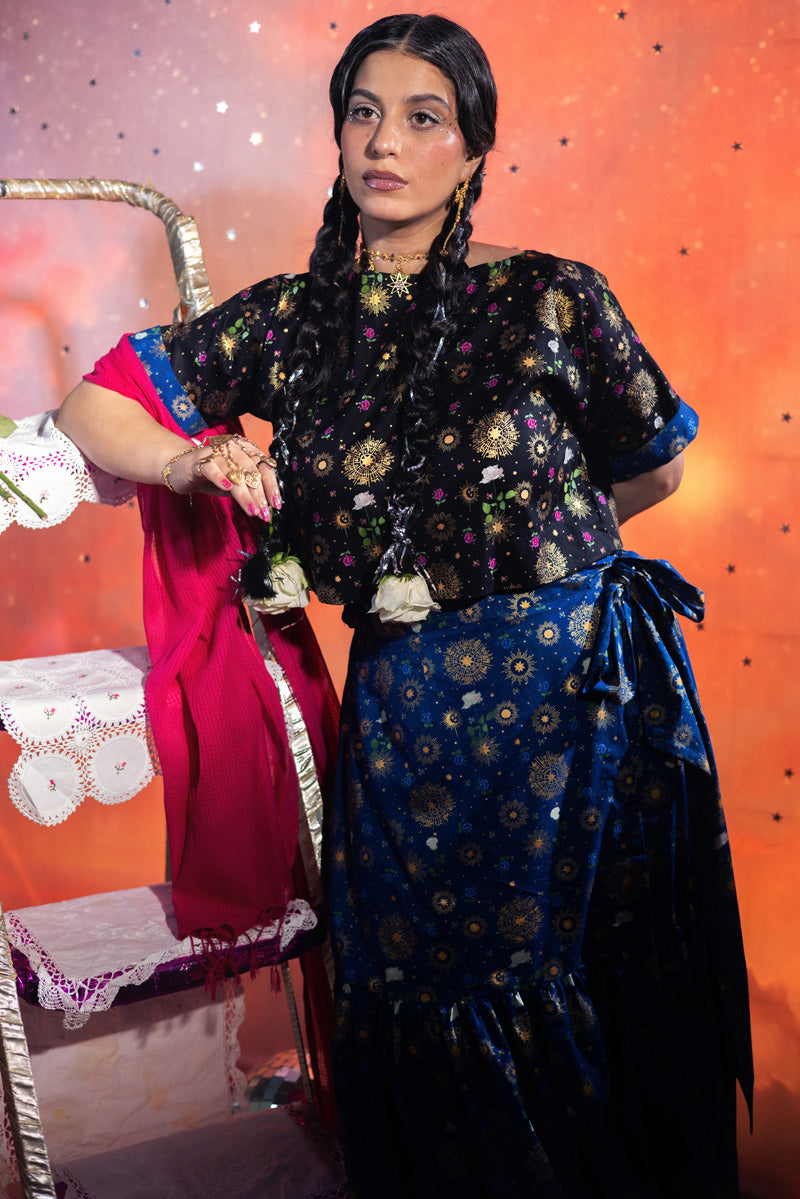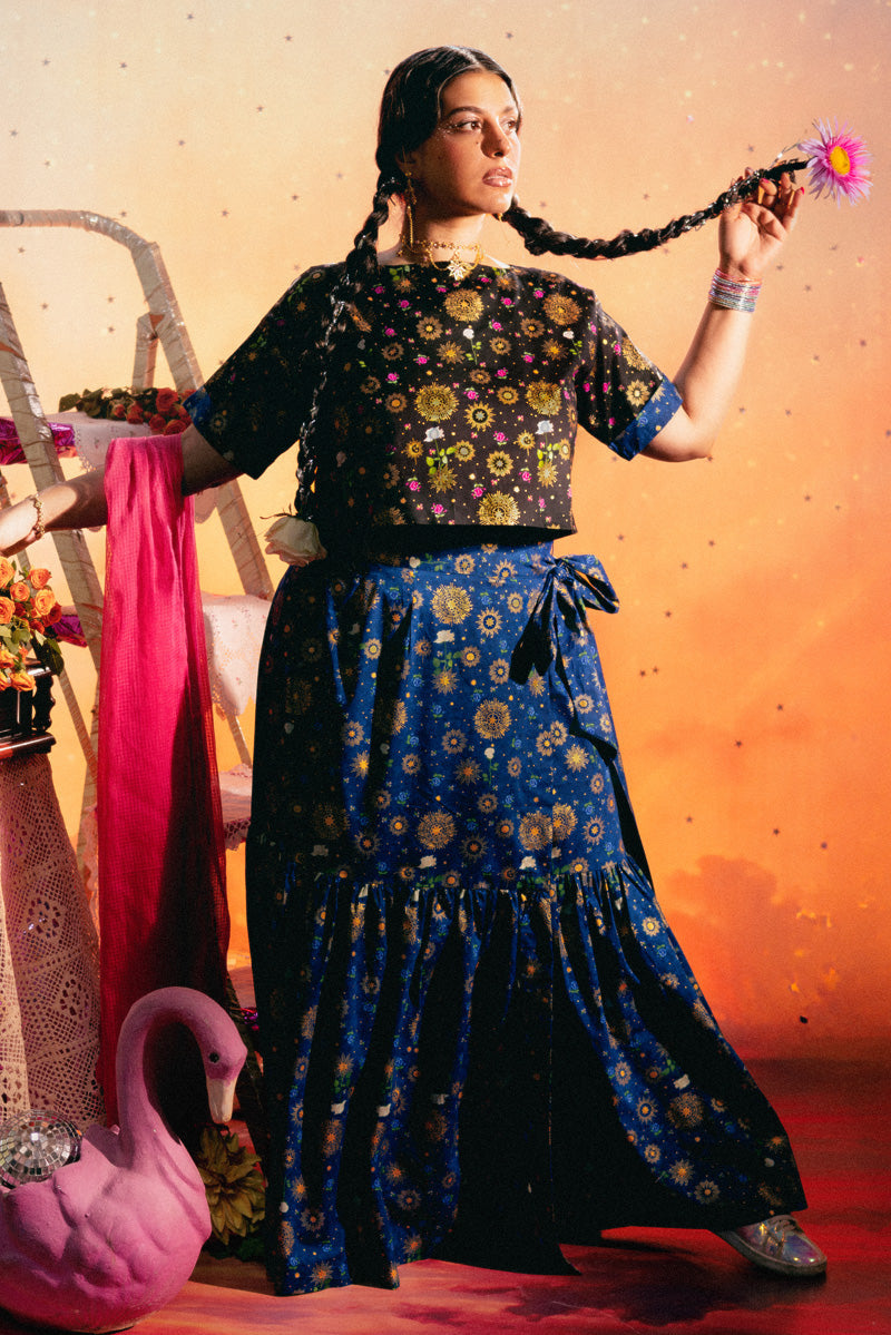 Vibrant printed short shirt with a boat neckline, half turn-up sleeves, and delicate heart cutwork at the back. Paired with a gathered flared paneled sarong, this outfit is a timeless statement piece.