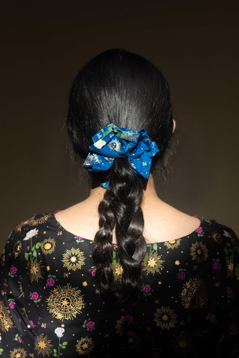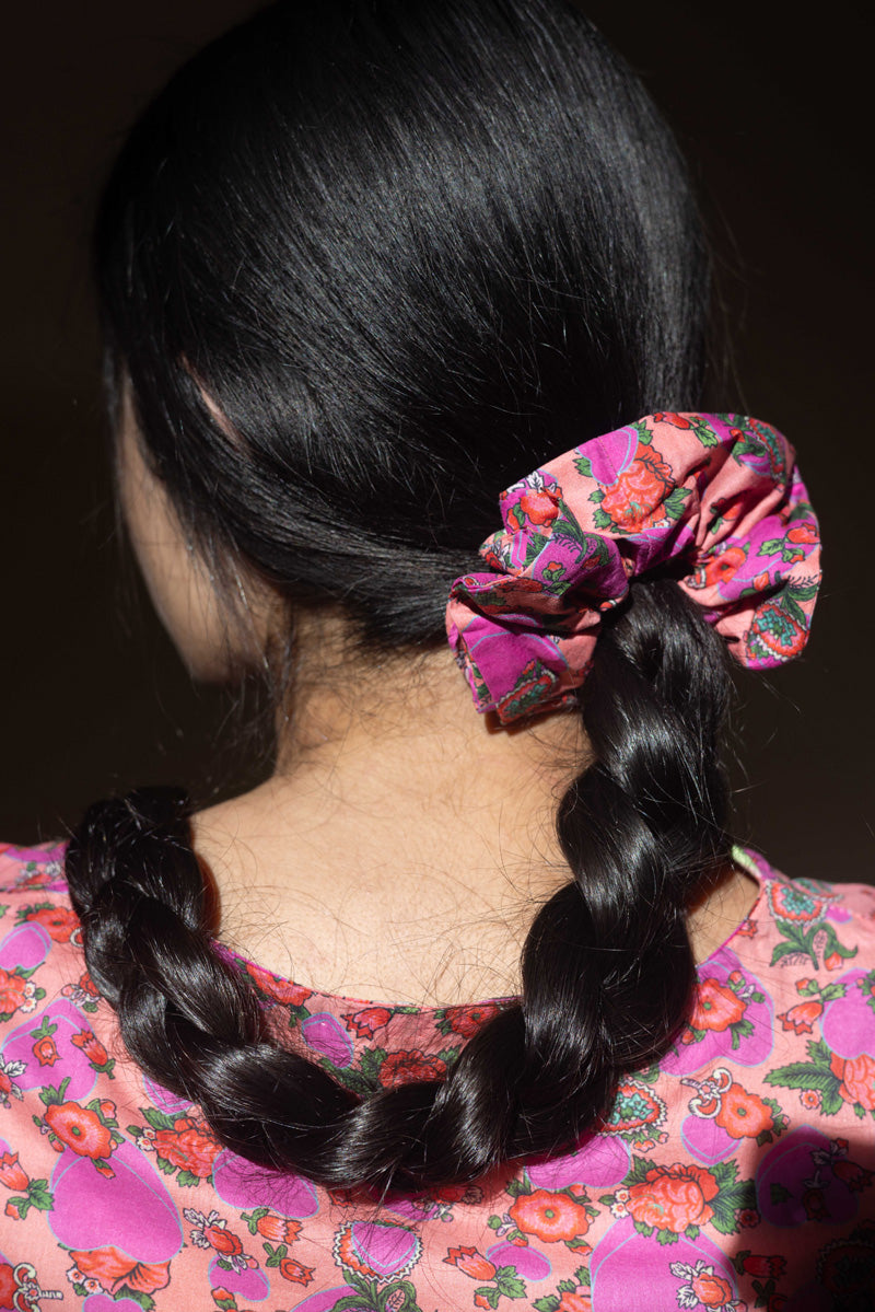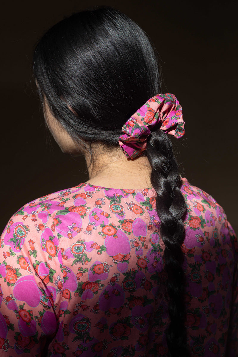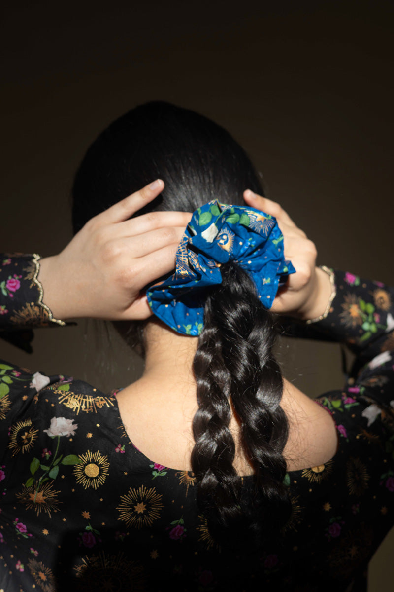 Luxury retro-printed scrunchies with vibrant patterns, adding a stylish touch to any look.
