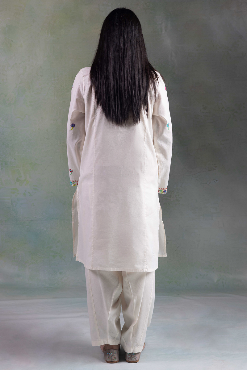 A classic-fit paneled shirt with a round neckline and V-slit, adorned with fun tassel detailing. The shirt is further enhanced with delicate all-over embroidery, paired with a classic-fit shalwar for a graceful, traditional look.