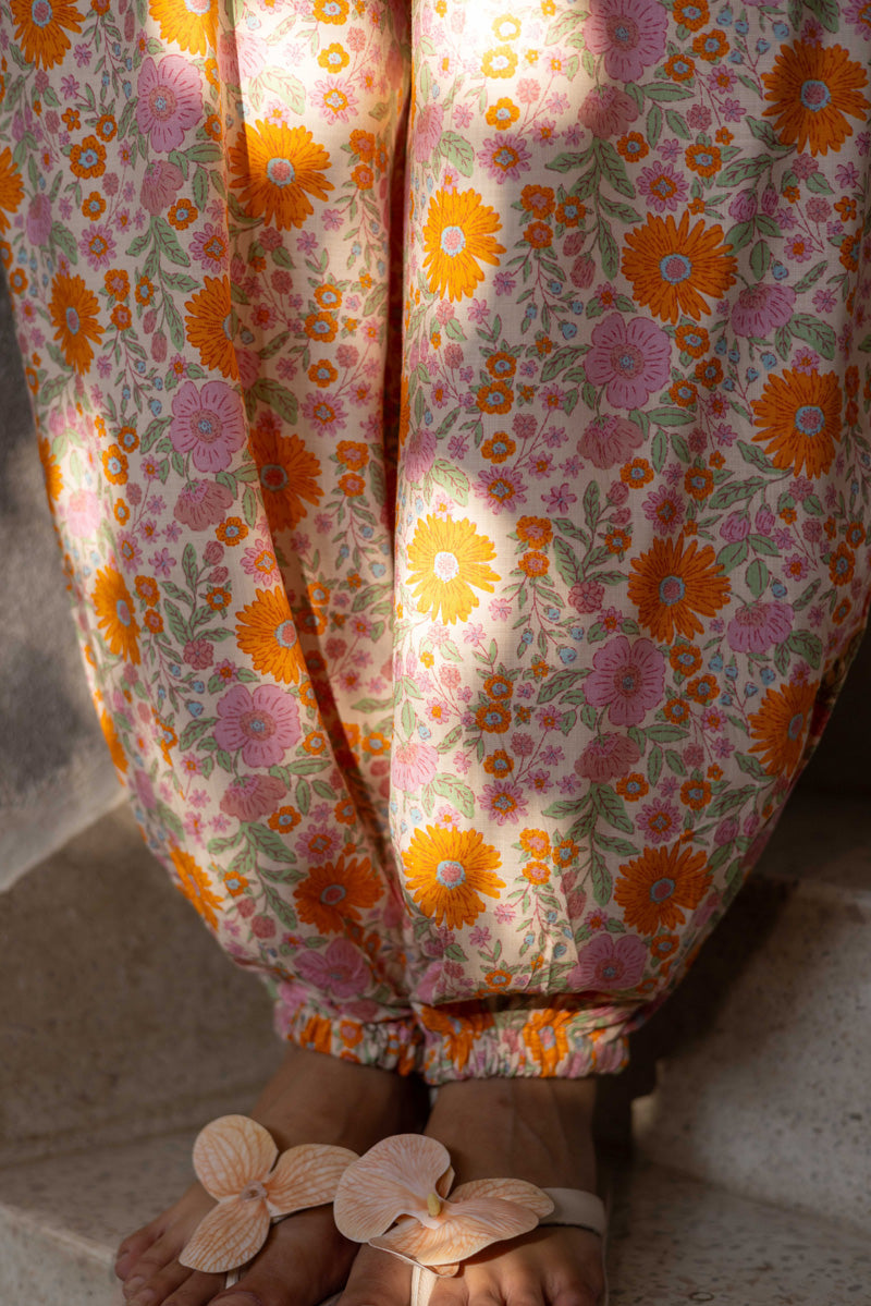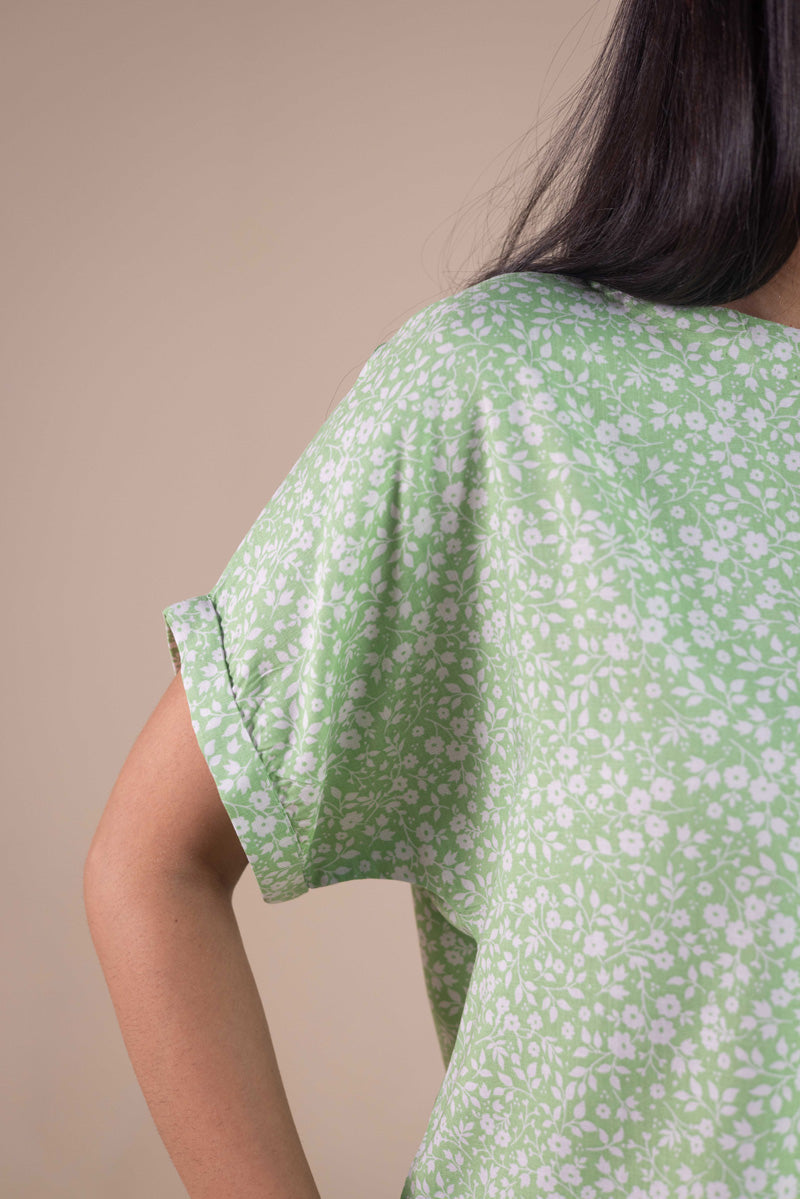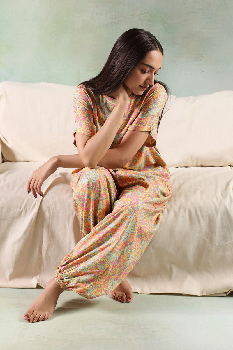 Relaxed-fit printed top with a round neckline and batwing sleeves finished with turn-up hems, and a rounded shirt hem. Paired with matching printed pajama featuring cinched hems for a comfortable yet stylish finish.