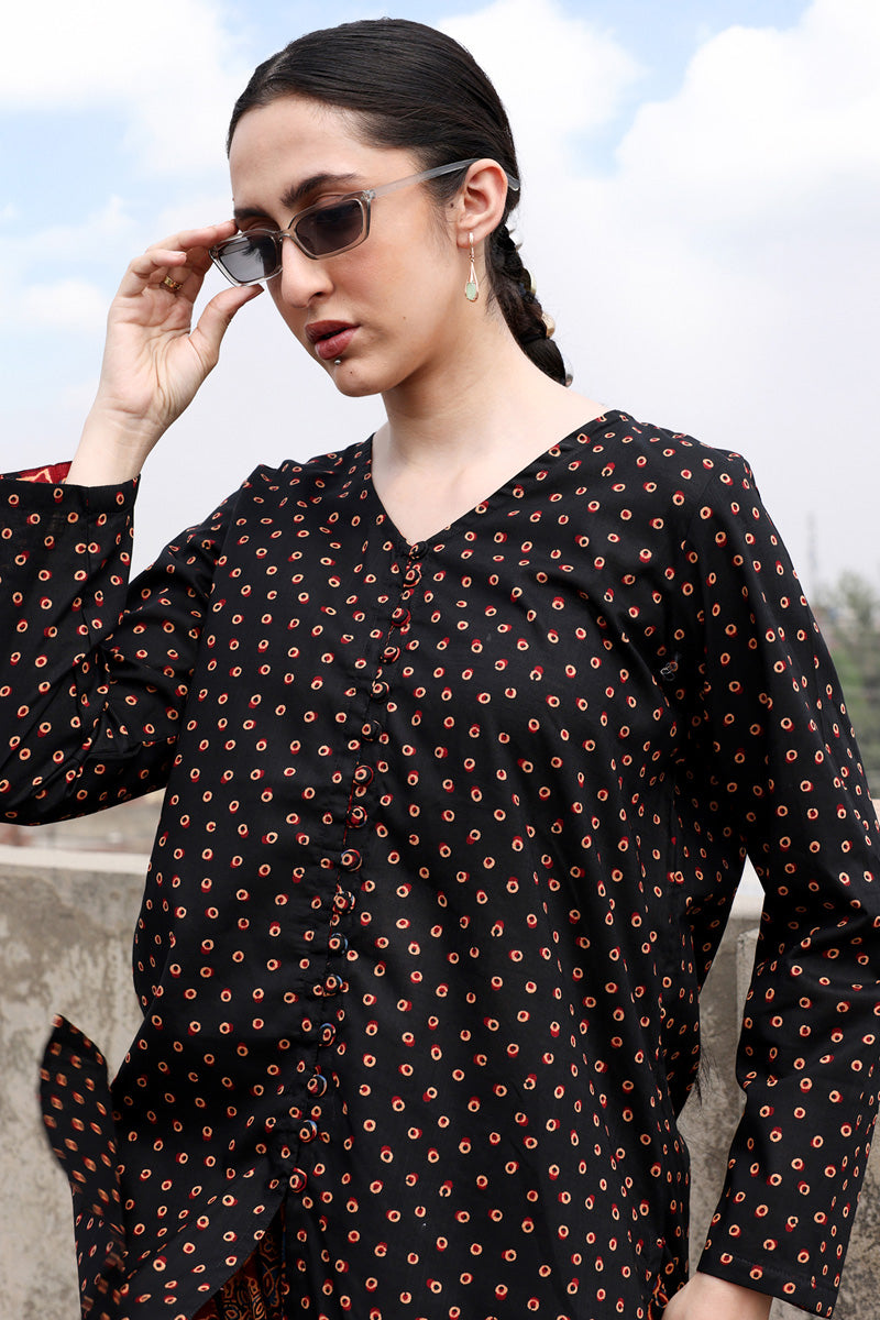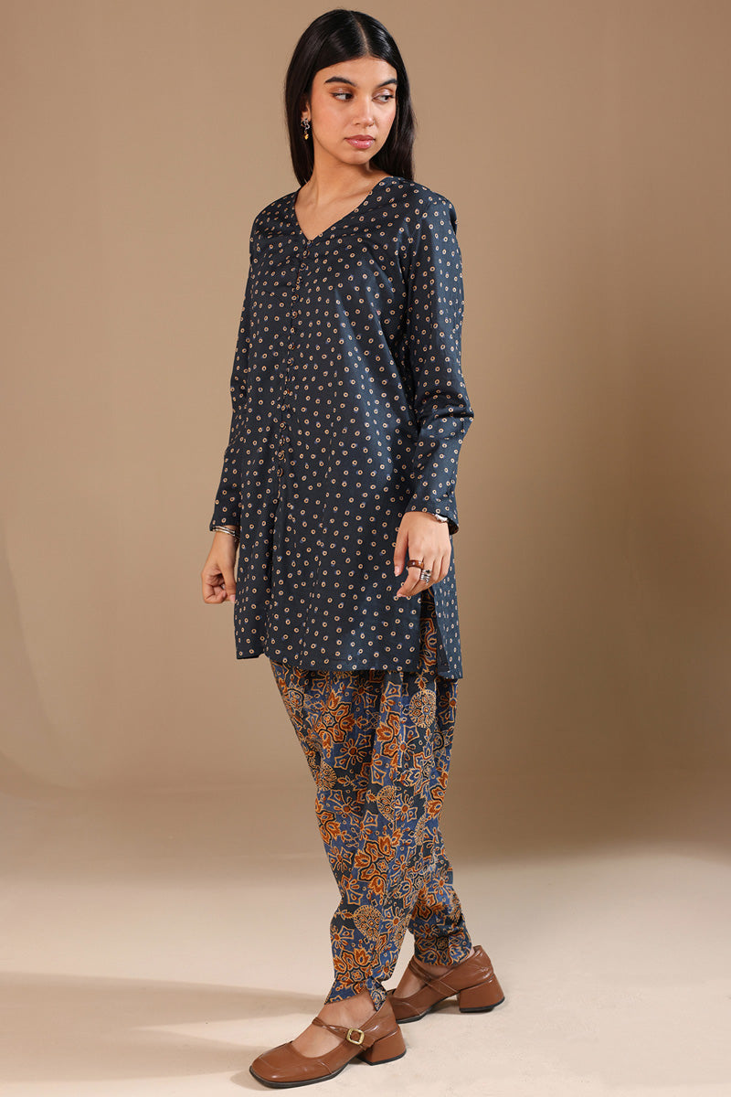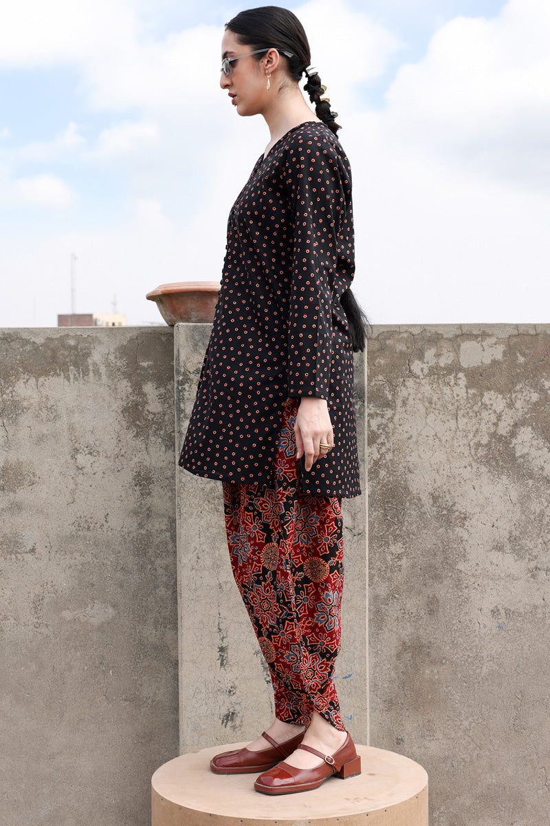 A classic-fit printed shirt with a round neckline and loop buttons along the front slit. Paired with complementary printed tulip shalwar.