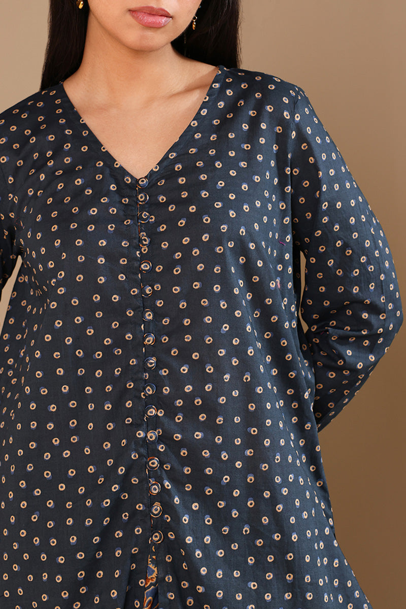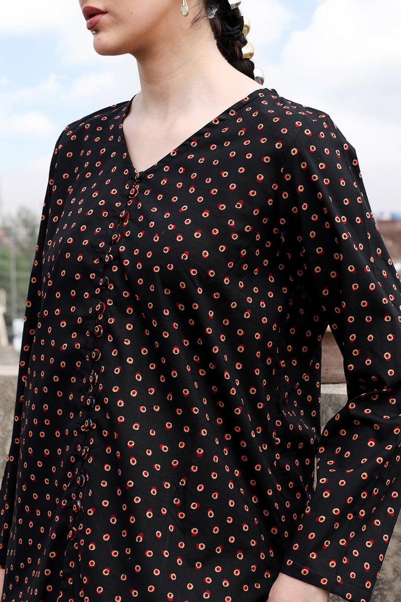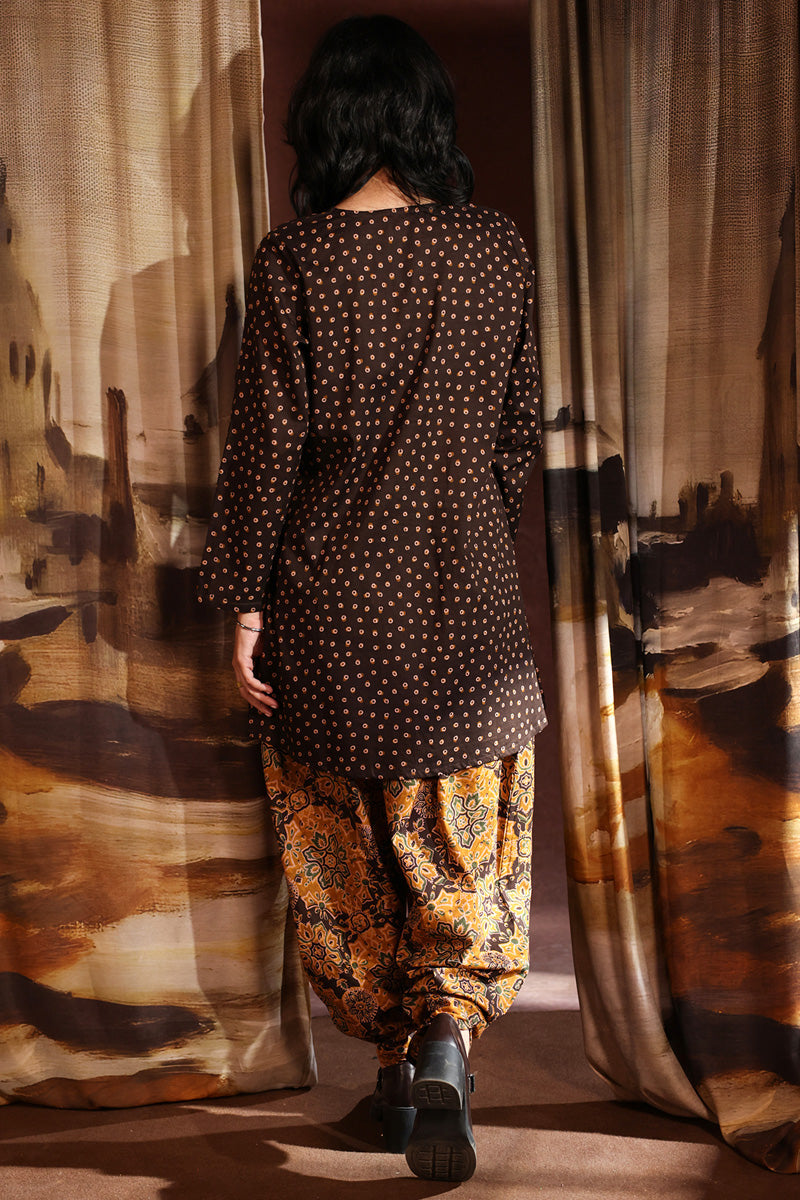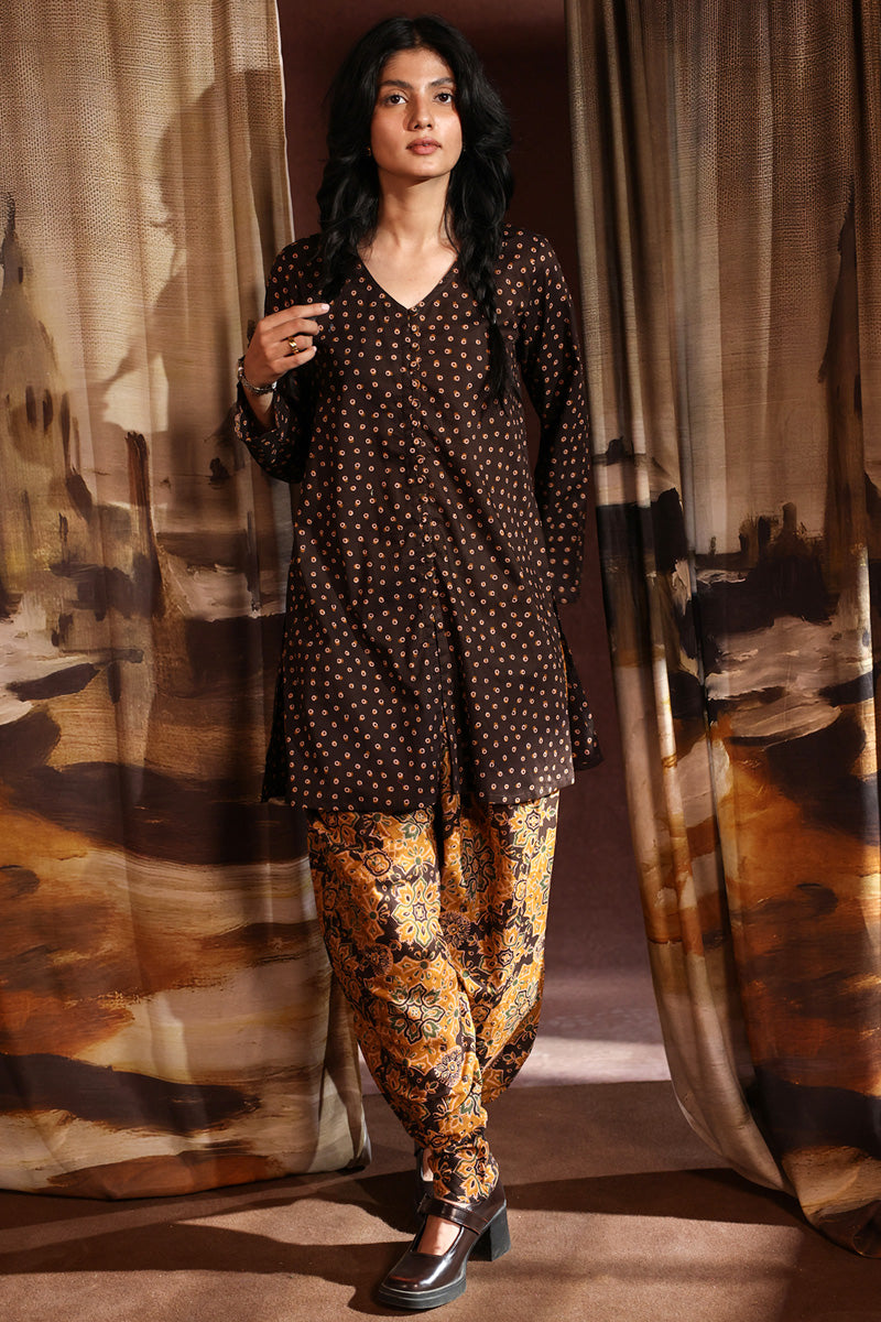 A classic-fit printed shirt with a round neckline and loop buttons along the front slit. Paired with complementary printed tulip shalwar.