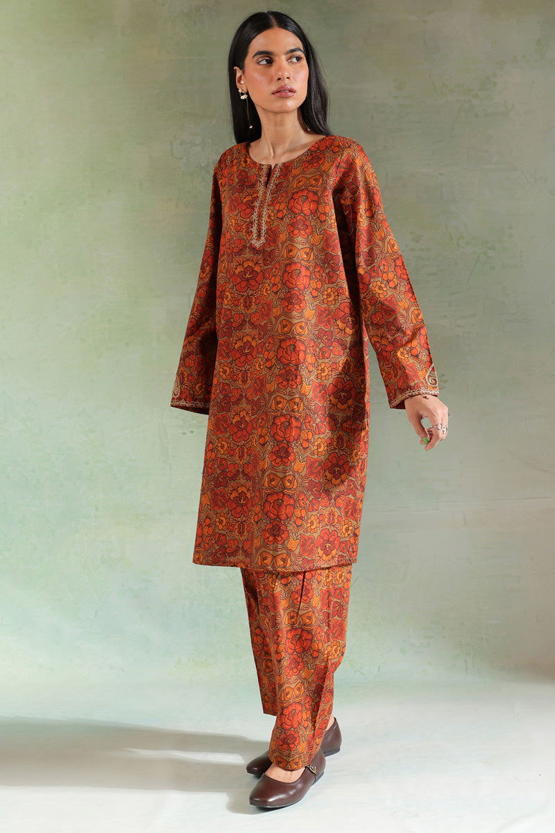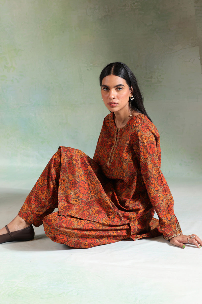 A classic-fit printed shirt with a round neckline and V-slit, adorned with delicate embroidered detailing on the neckline and sleeve hems. Paired with a matching printed classic-fit shalwar.
