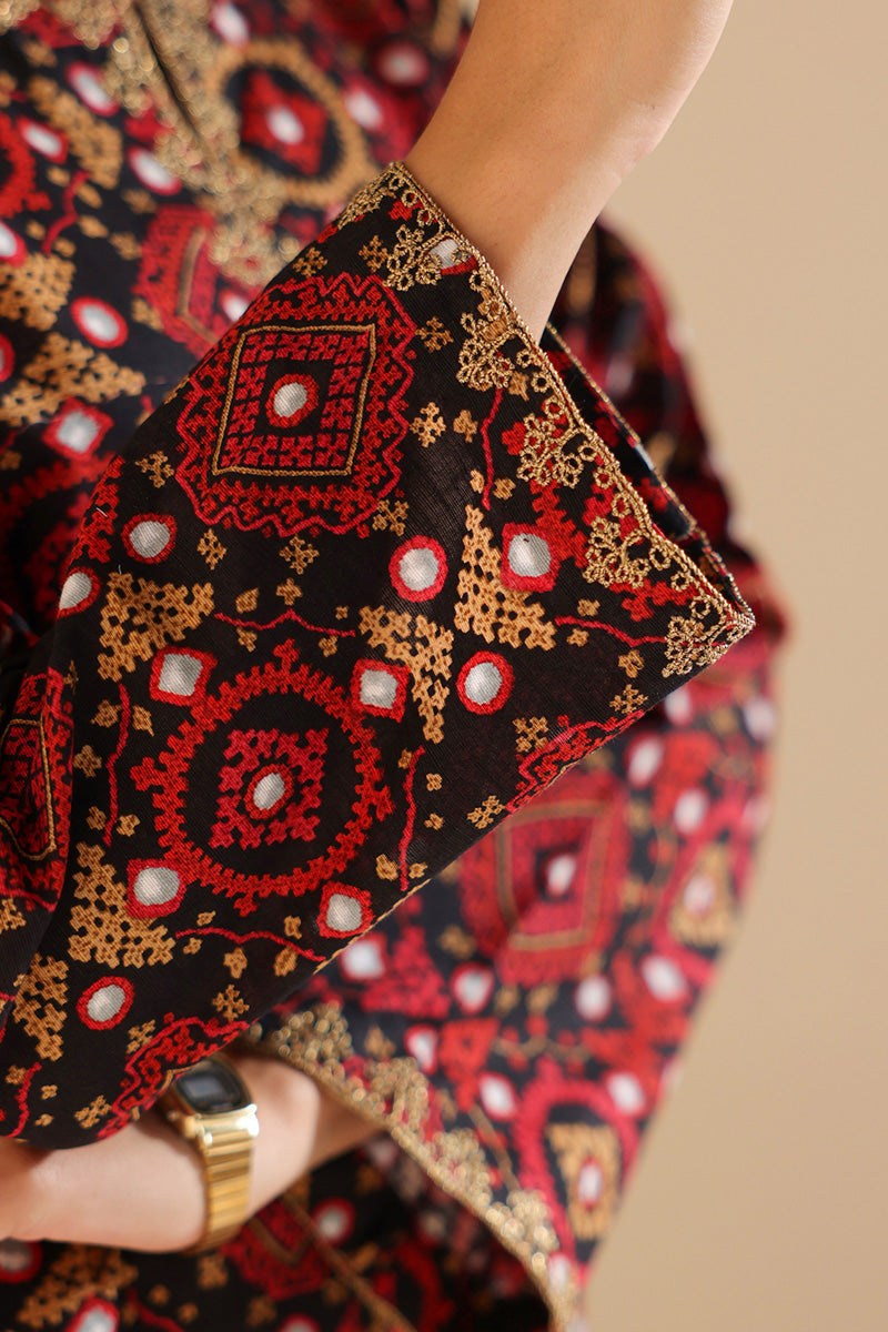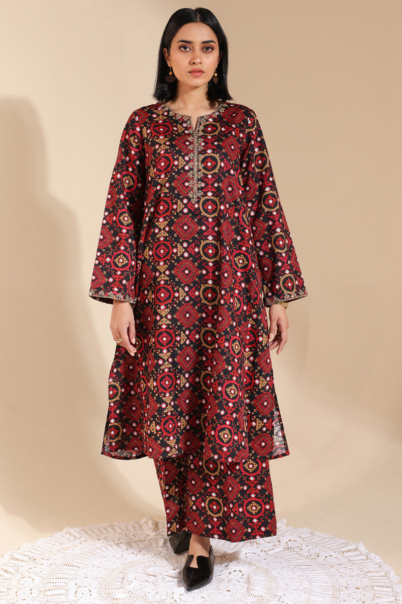 Classic-fit A-line printed shirt with a round neckline and V-slit, adorned with delicate embroidery along the neckline and sleeve hems. Paired with matching printed culottes.