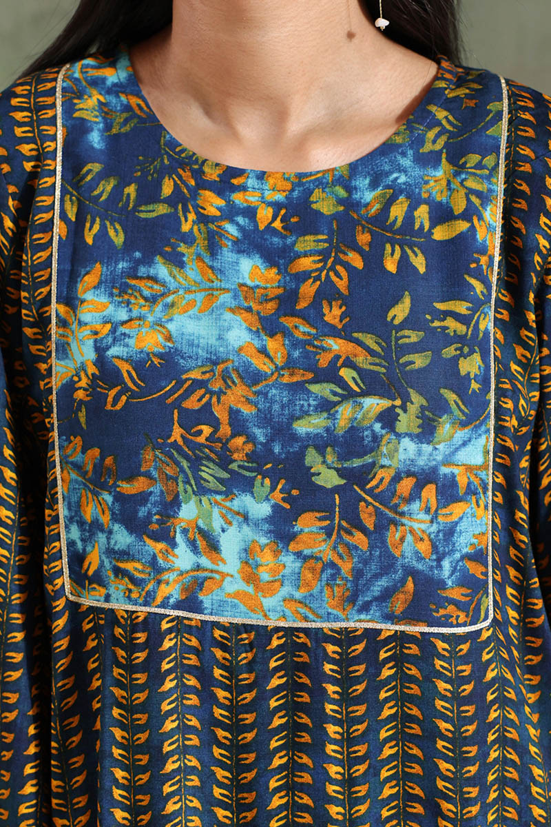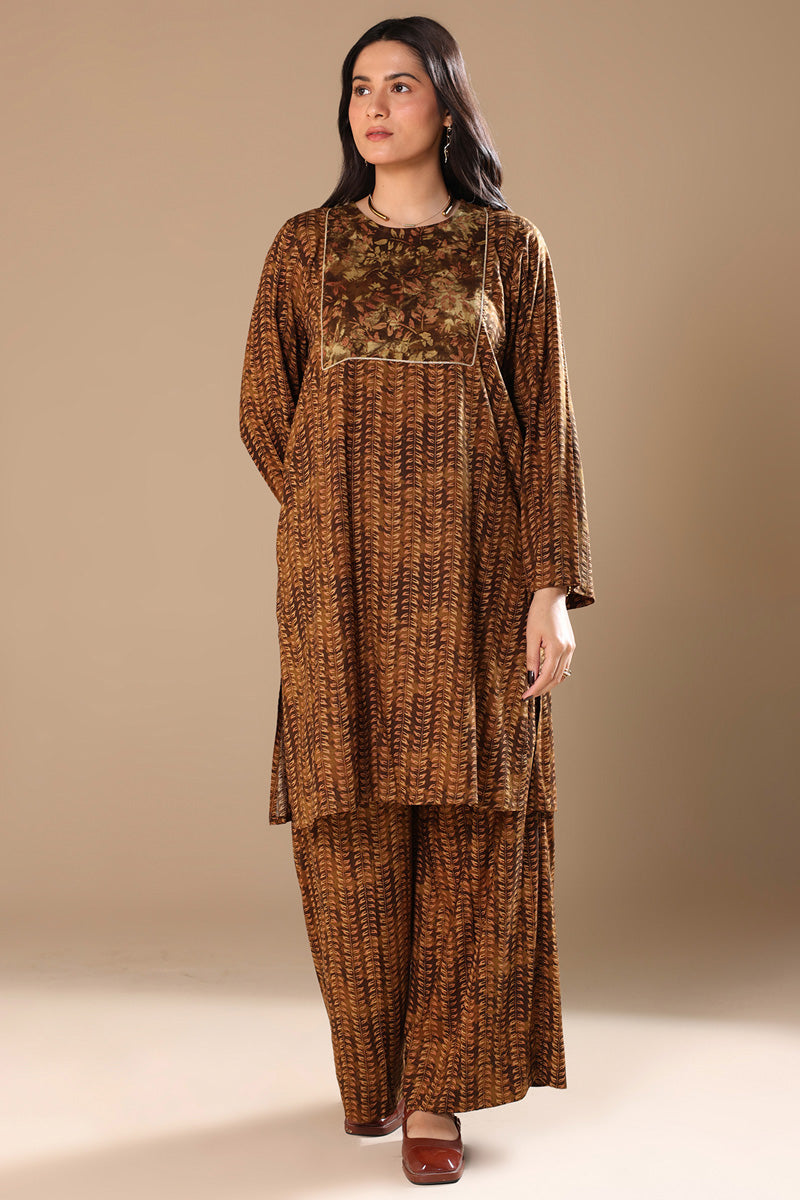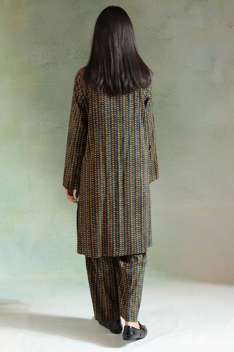 A classic-fit printed shirt with lace detailing on the bodice. Paired with matching printed culottes for a coordinated look.