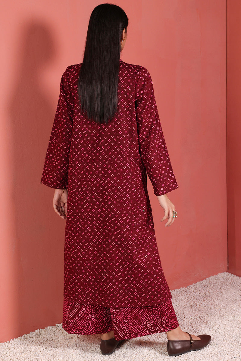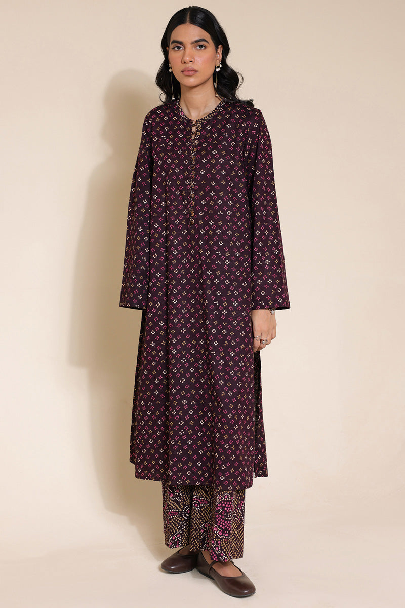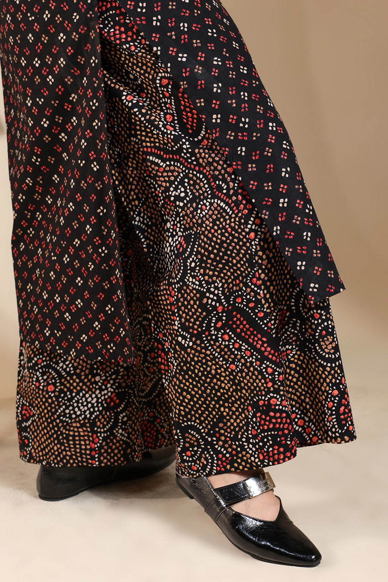 A relaxed-fit printed shirt with a round neckline and loop-button detailing along the front slit. Paired with matching printed culottes for a coordinated look.