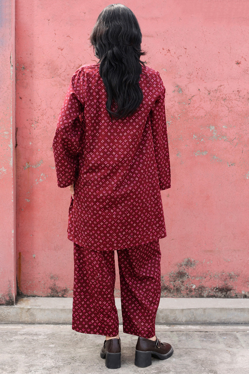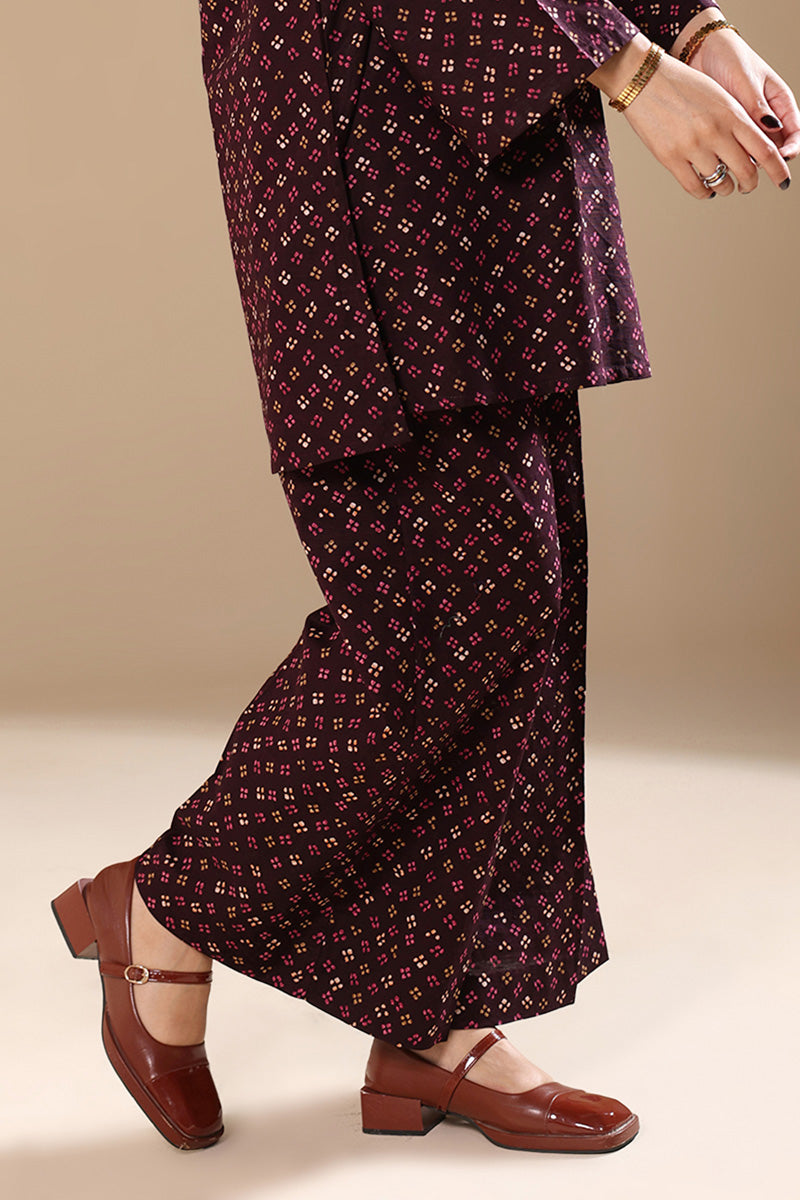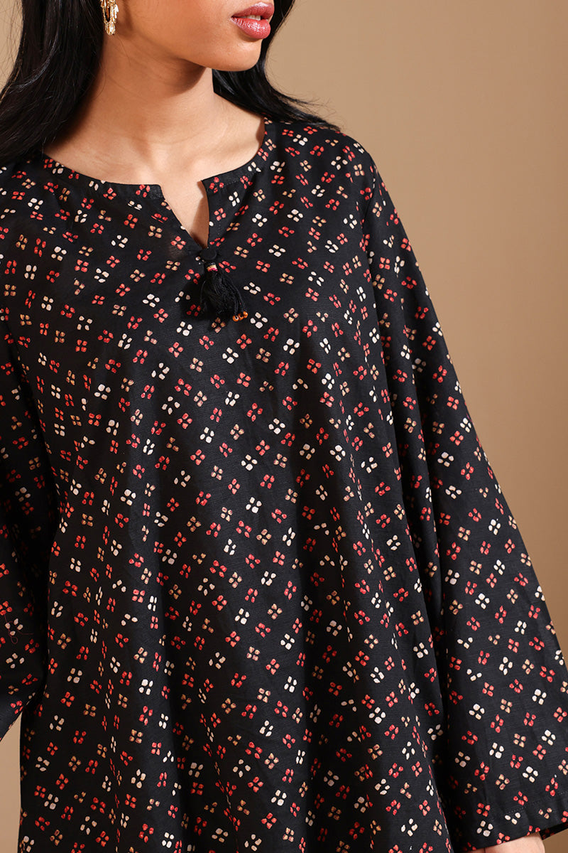 An A-line printed shirt with a round neckline and V-slit, adorned with tassel detailing. Paired with matching printed culottes for a coordinated look.