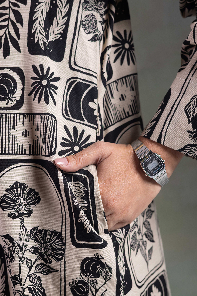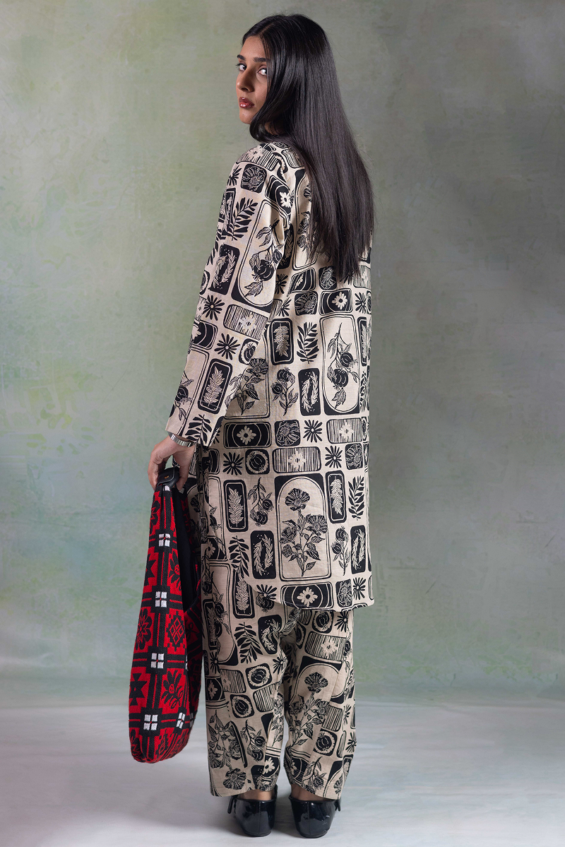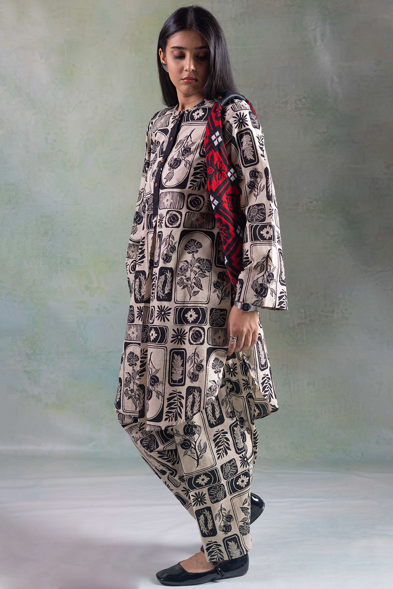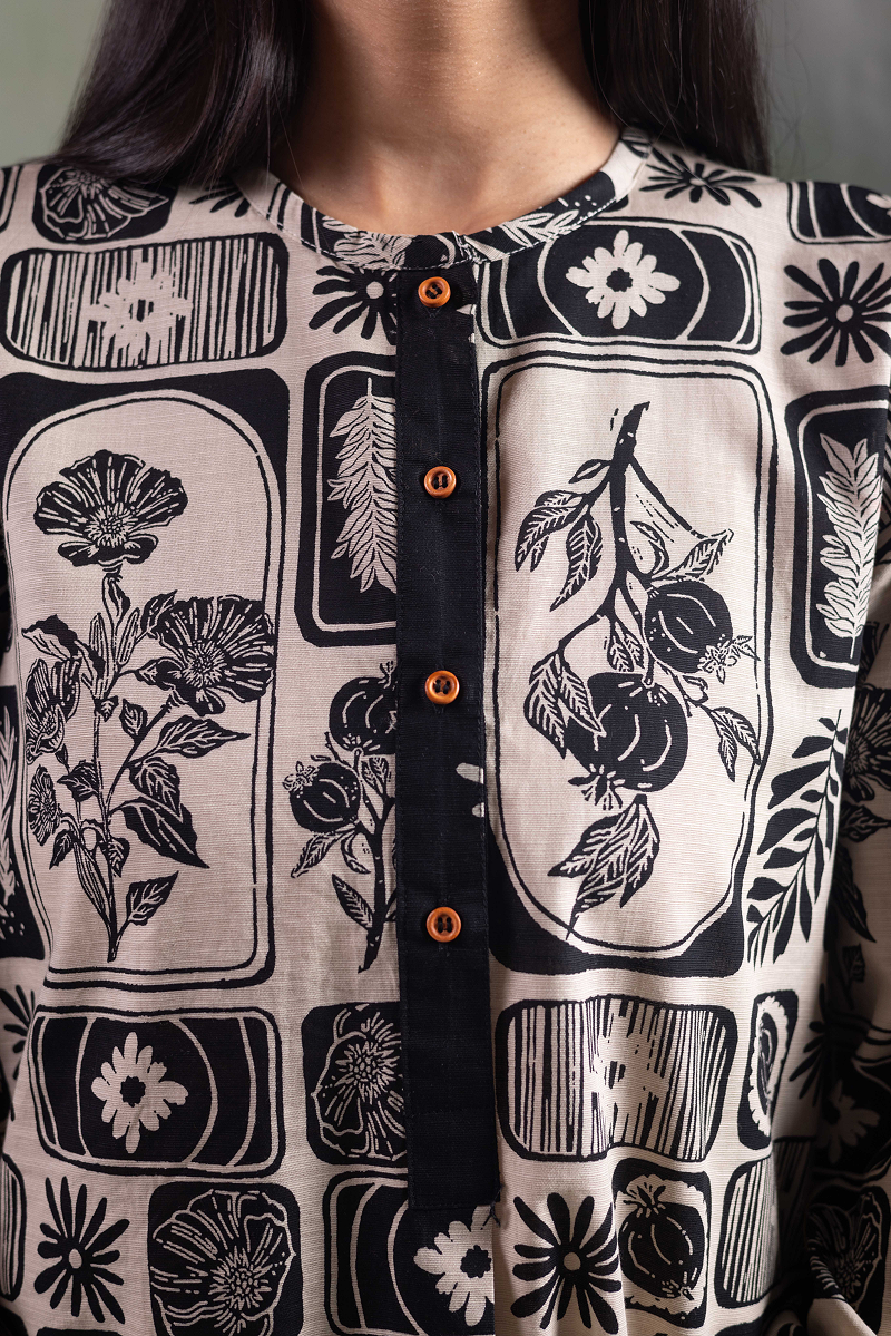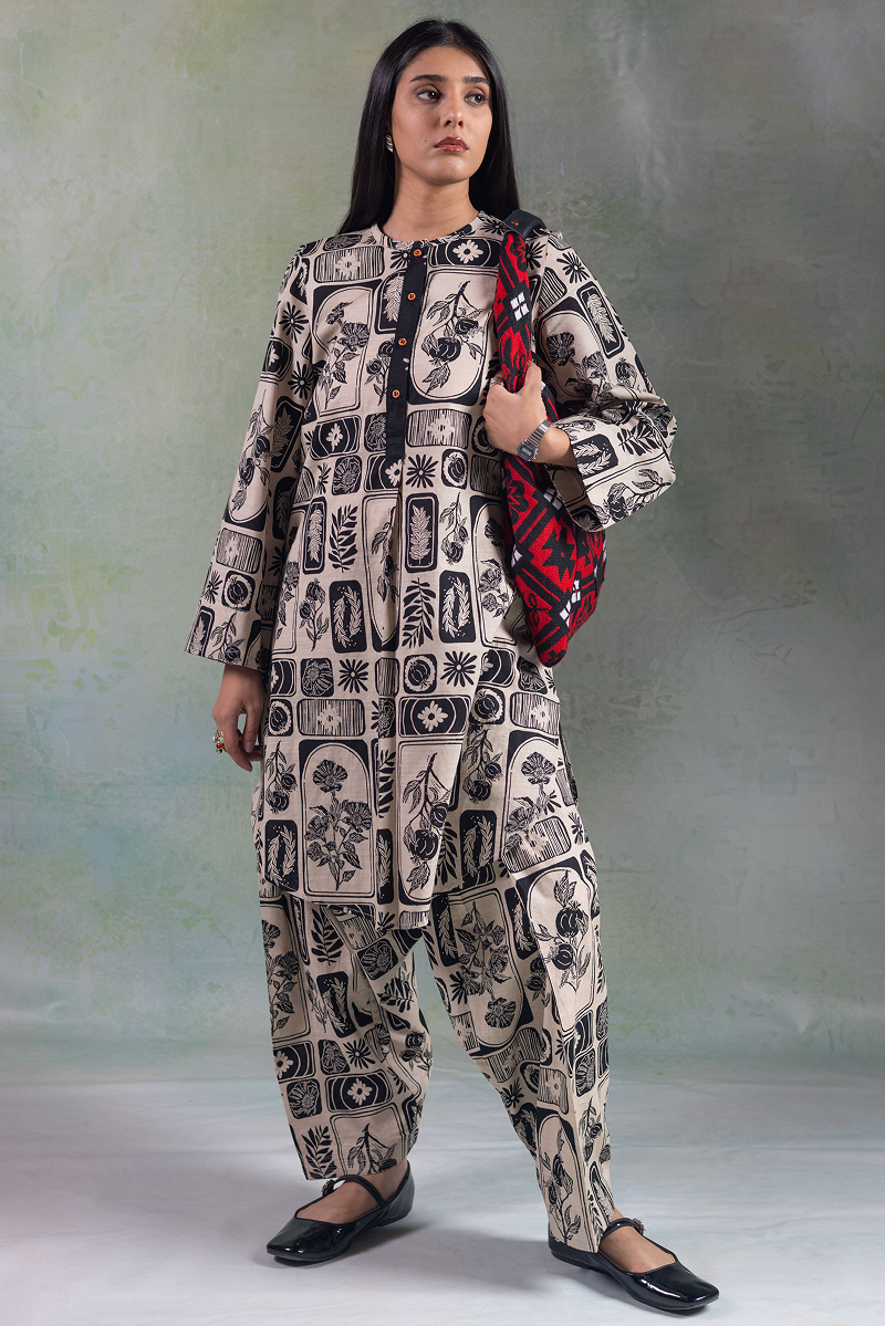 A classic-fit printed shirt with a round neckline and button detailing along the front overlap placket. Designed with a rounded hem and functional side pockets for added comfort. Paired with printed classic-fit shalwar.