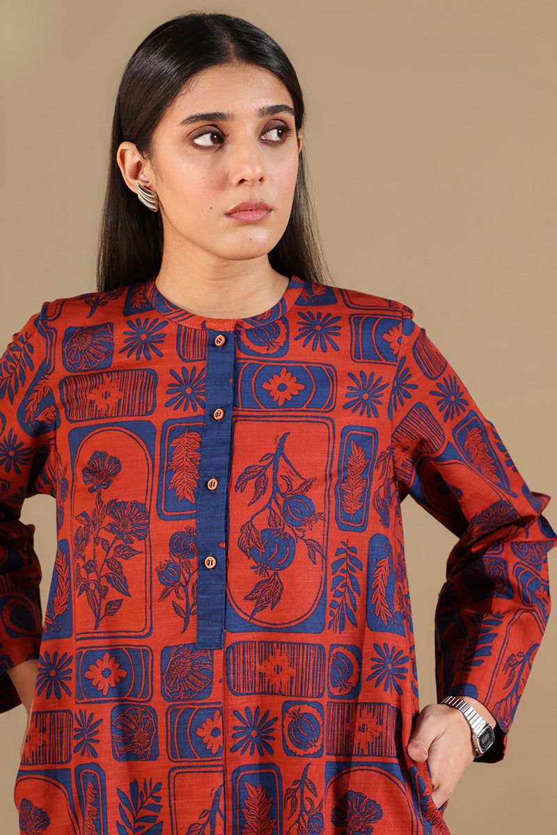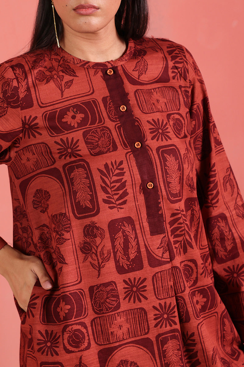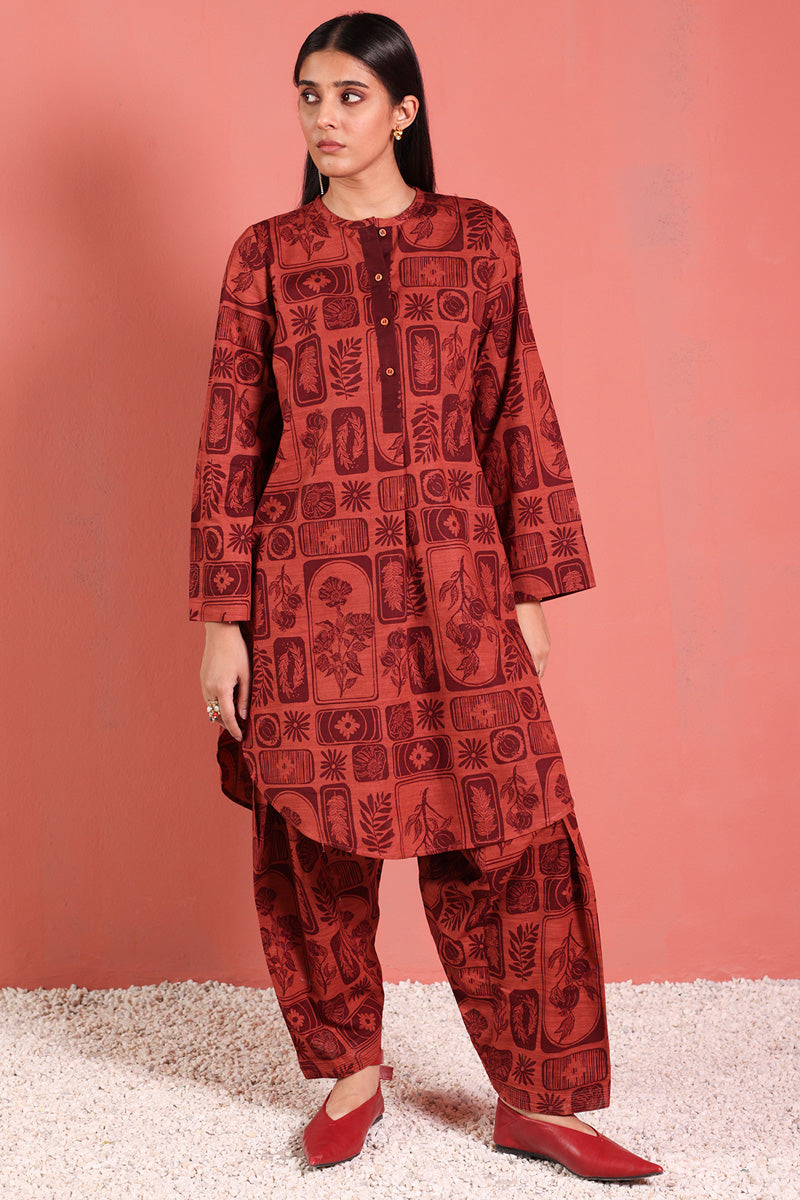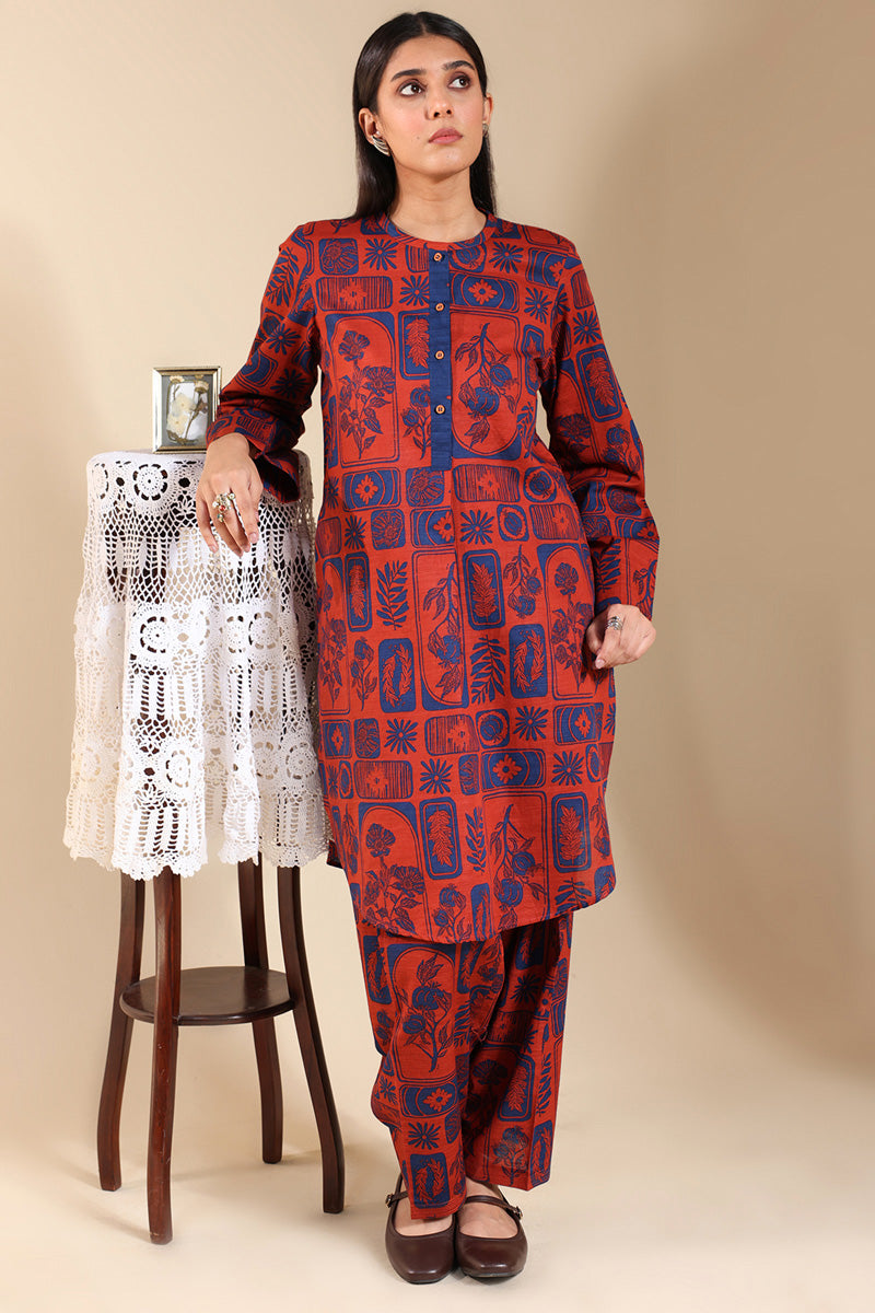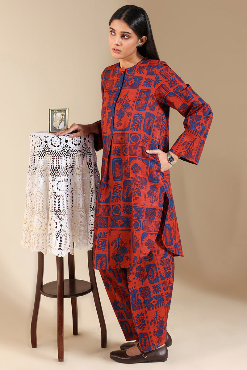 A classic-fit printed shirt with a round neckline and button detailing along the front overlap placket. Designed with a rounded hem and functional side pockets for added comfort. Paired with printed classic-fit shalwar.