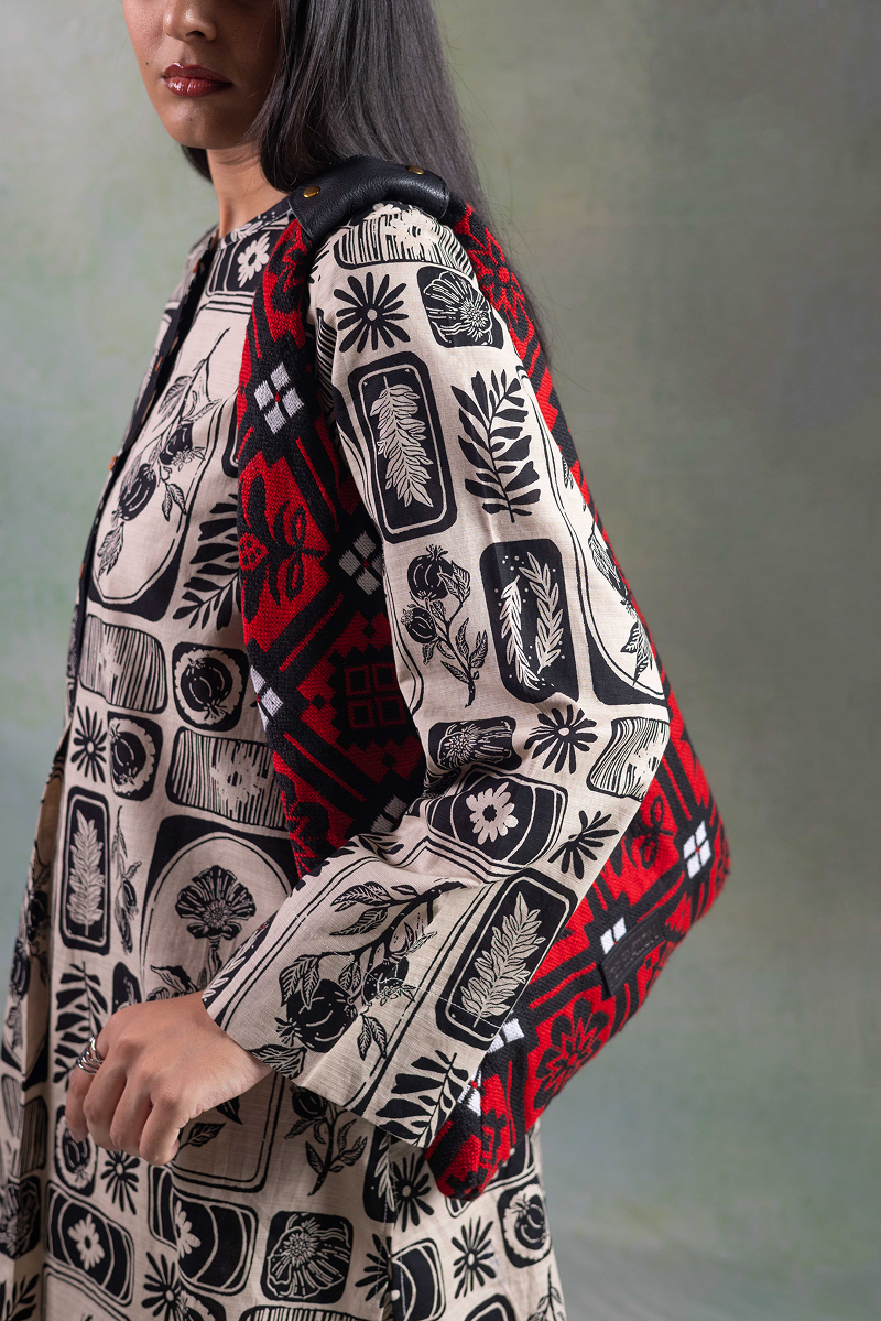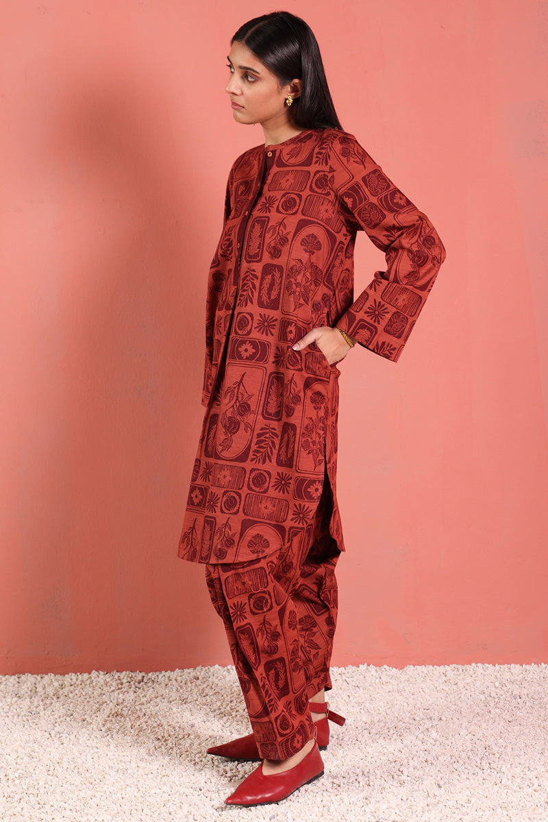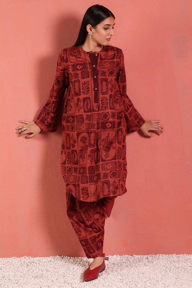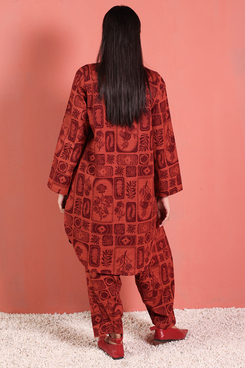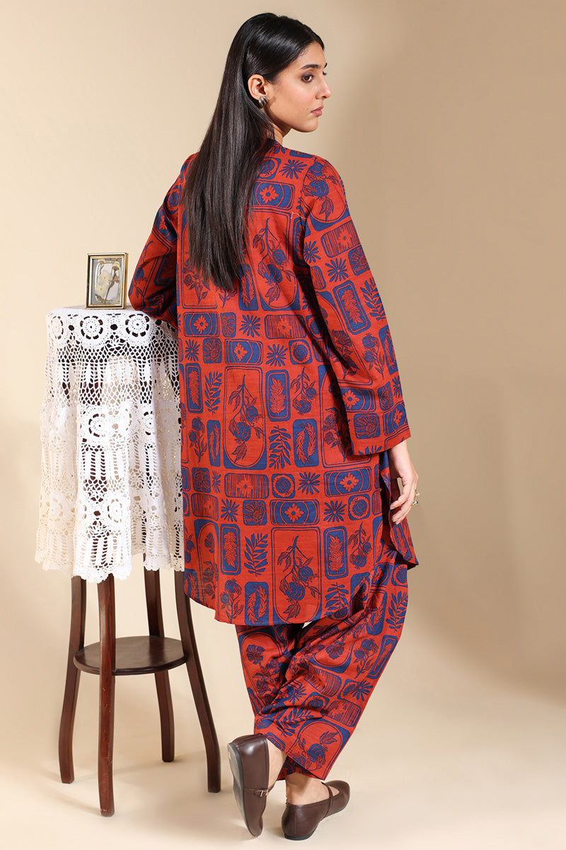 A classic-fit printed shirt with a round neckline and button detailing along the front overlap placket. Designed with a rounded hem and functional side pockets for added comfort. Paired with printed classic-fit shalwar.