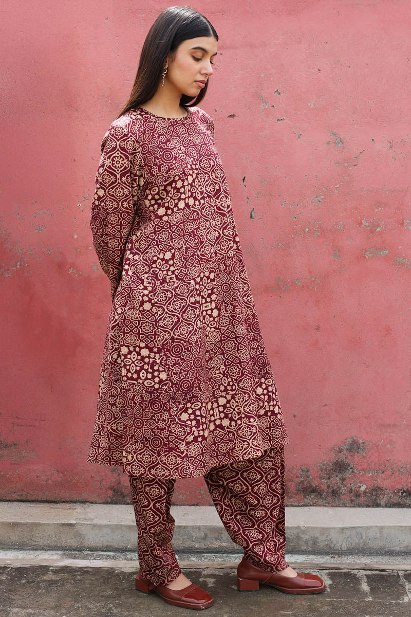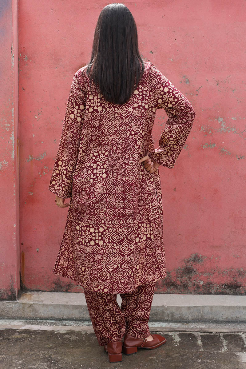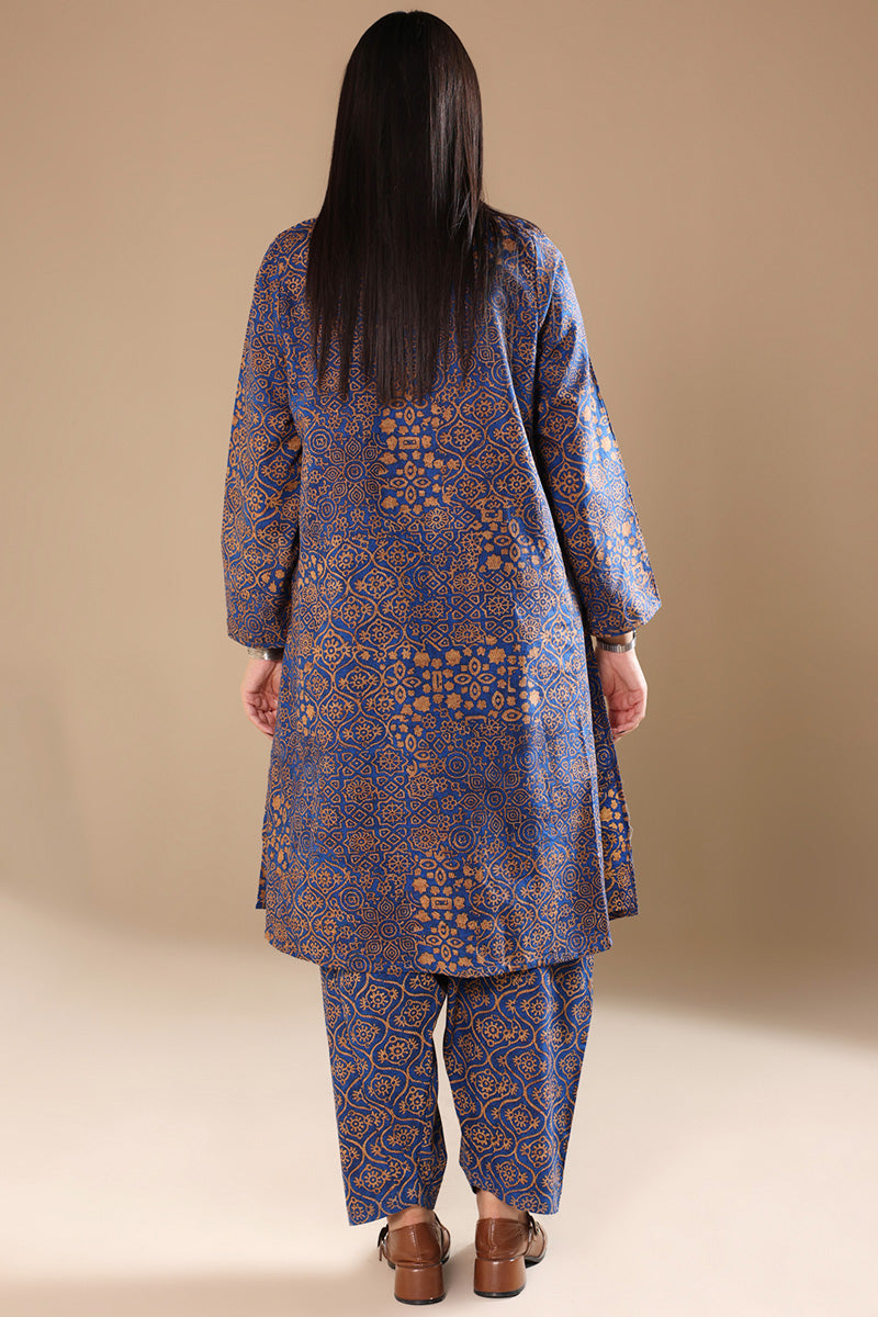 A classic-fit, A-line printed shirt with a round neckline. Paired with a classic-fit printed shalwar.