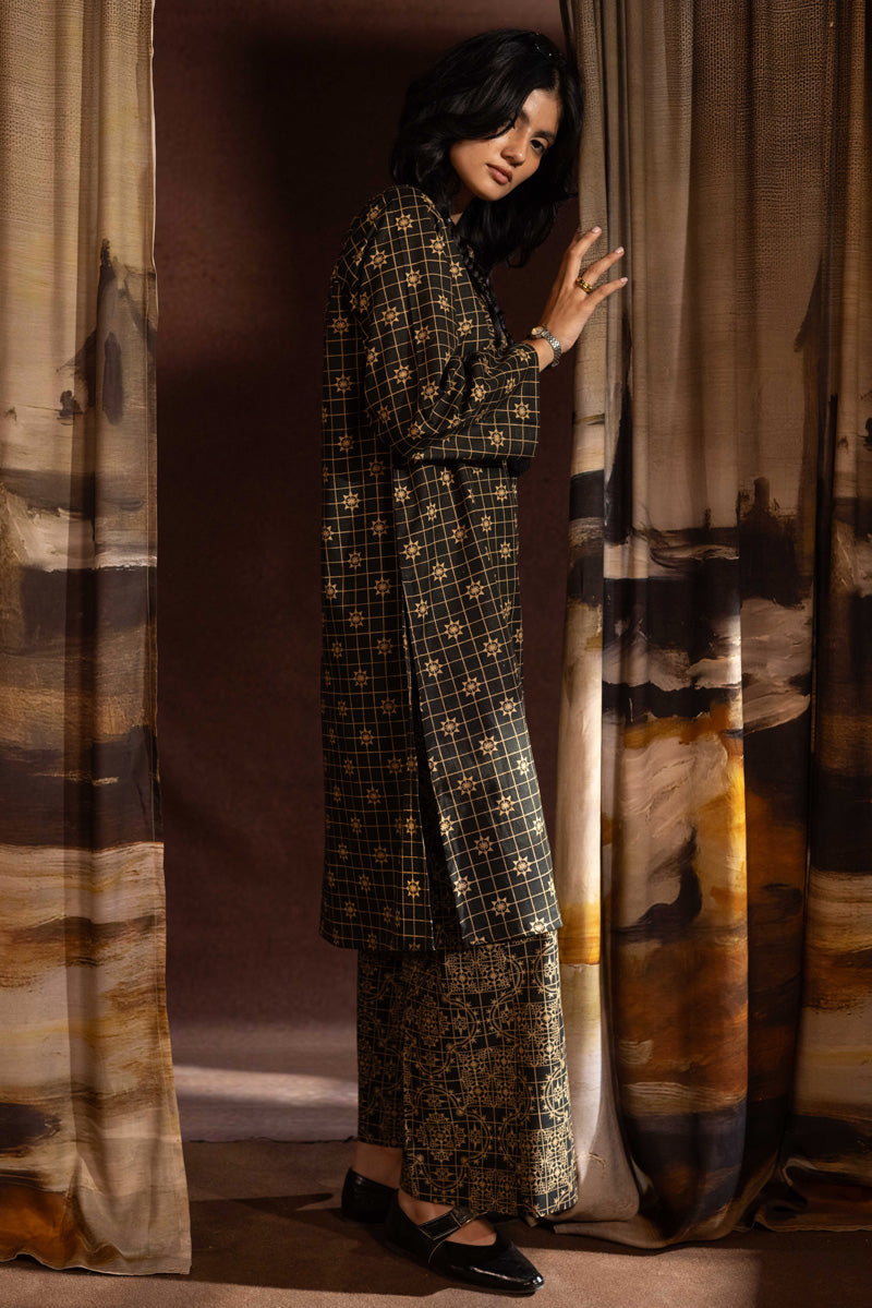 A classic-fit printed shirt with a round neckline and V-slit, adorned with tassel detailing. Paired with printed culottes for a coordinated look.