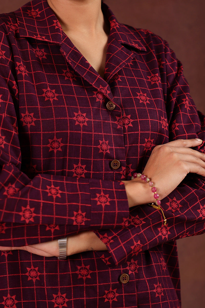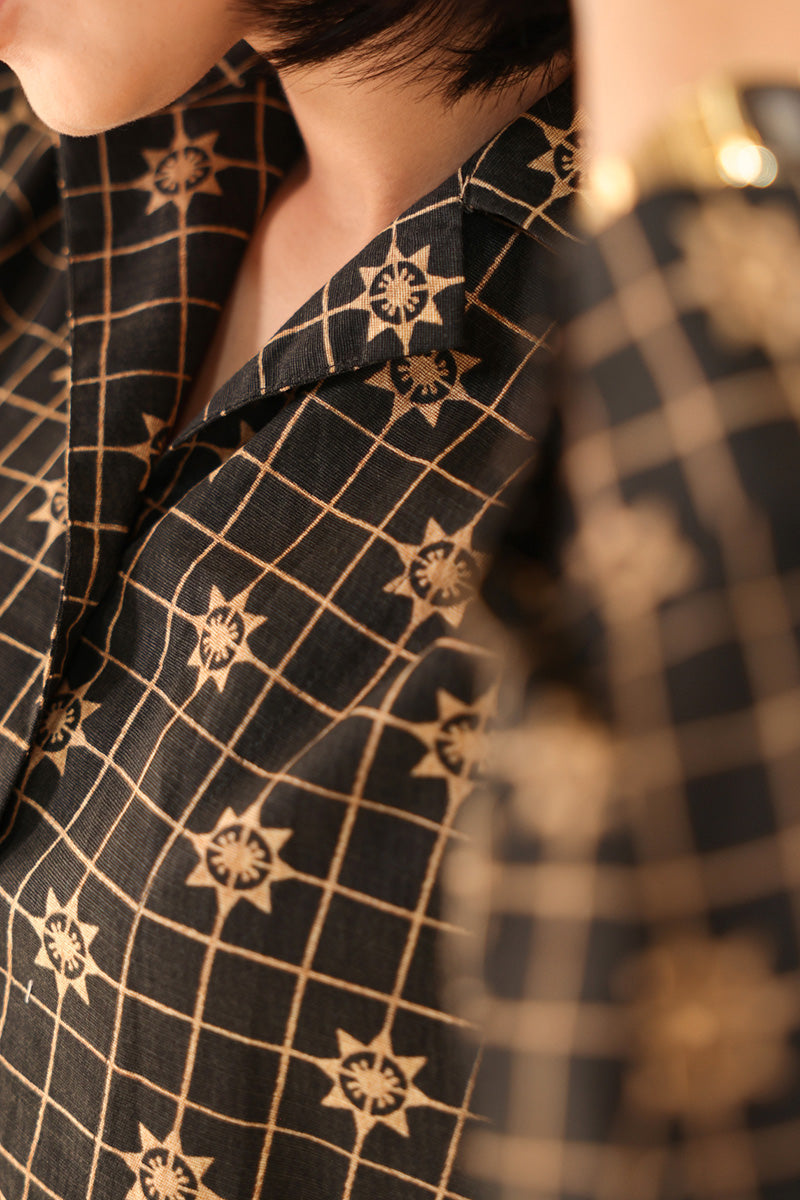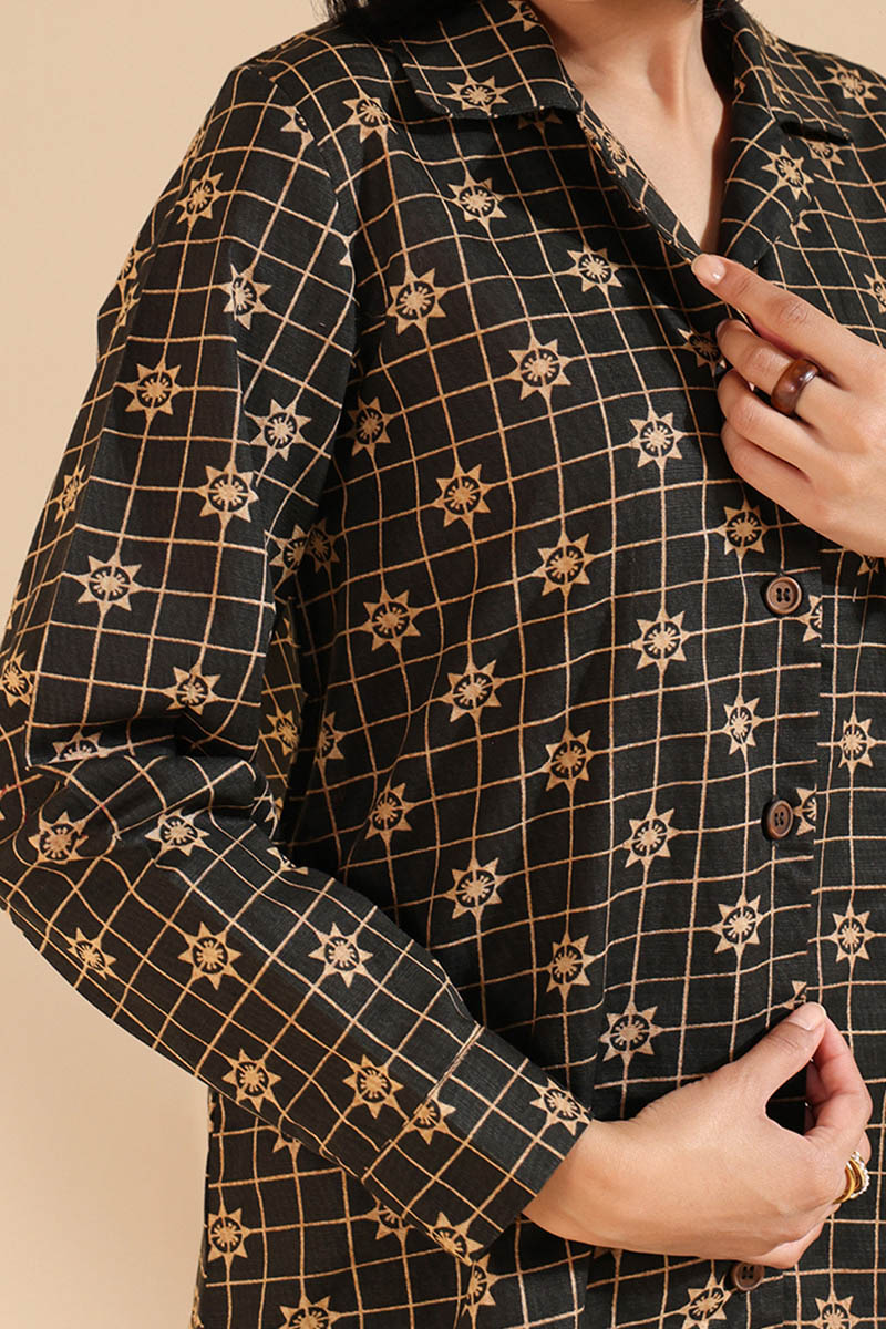 A classic-fit printed shirt with a collared neckline and buttons along the front placket, paired with complementary printed culottes for a coordinated look.