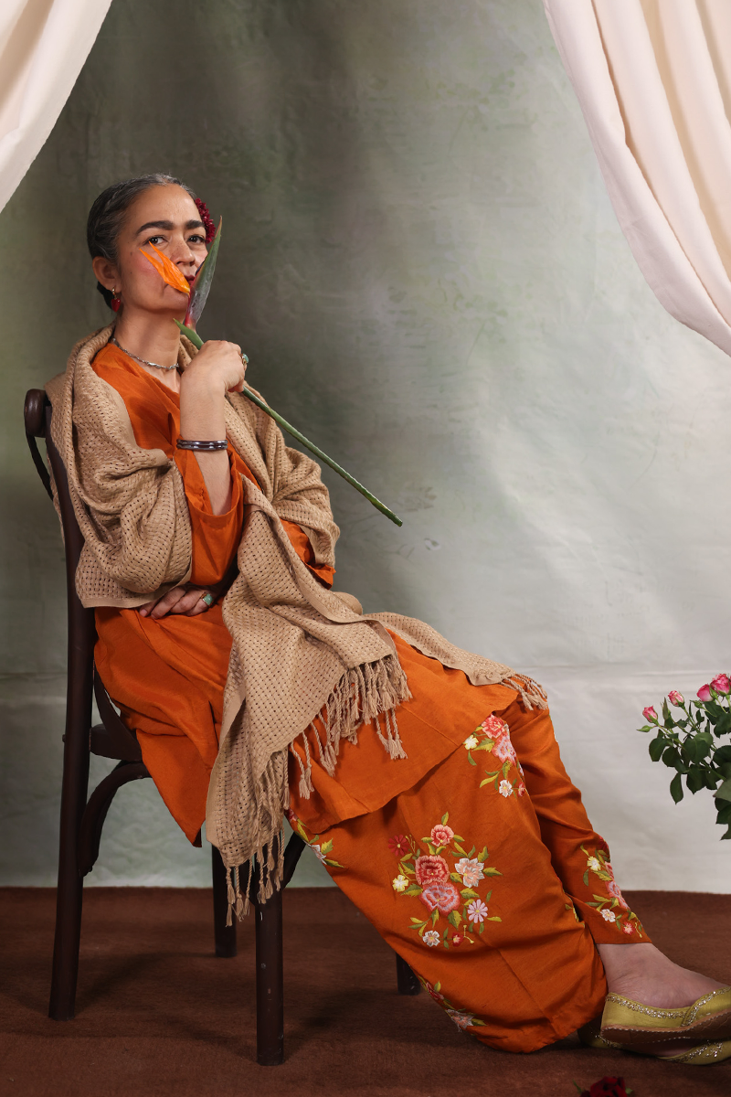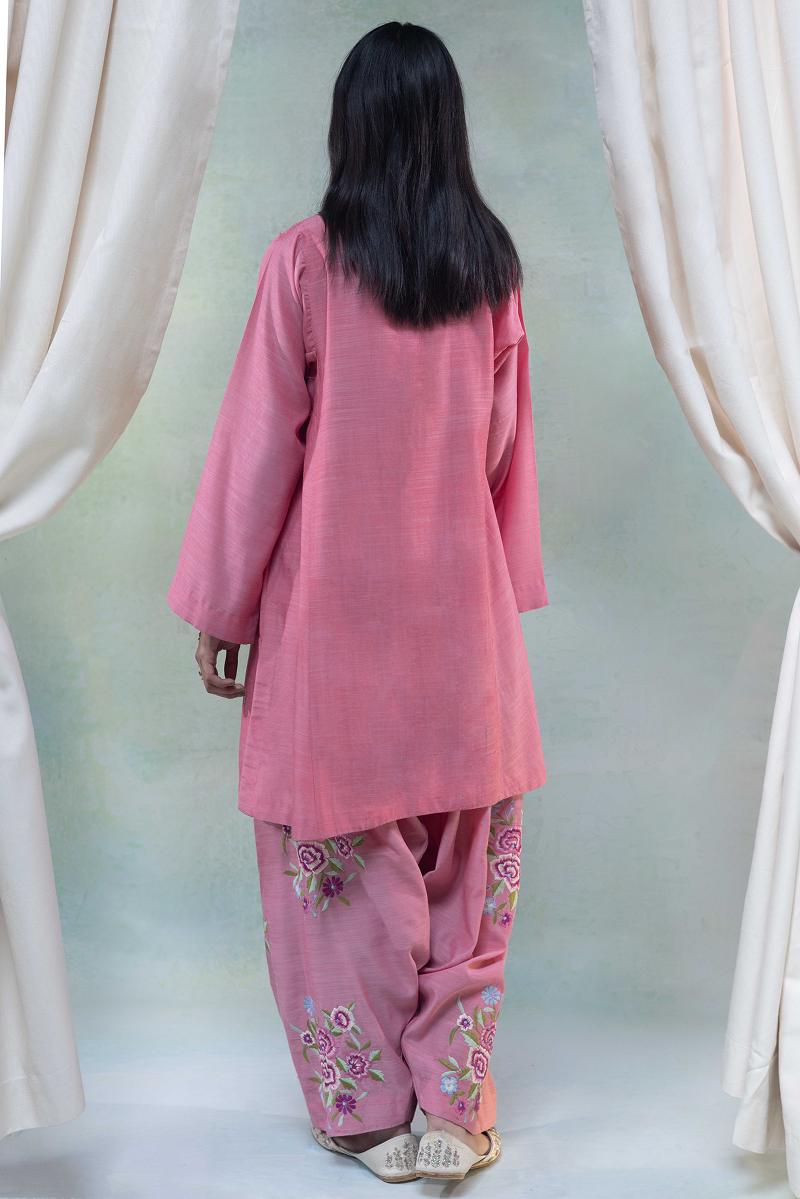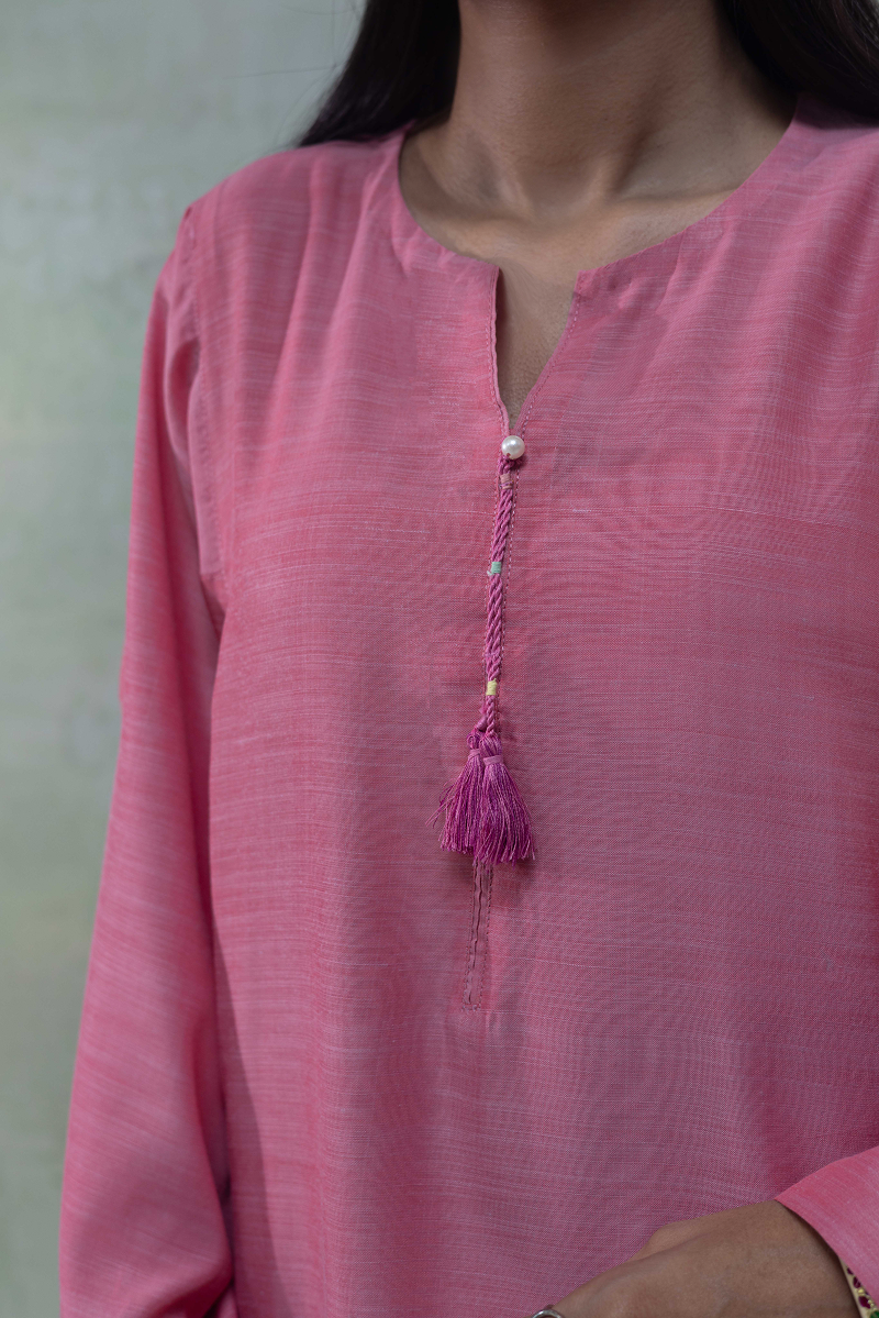 An A-line paneled shirt with a round neckline and V-slit, adorned with tassel detailing. Paired with an embroidered khula poncha shalwar.