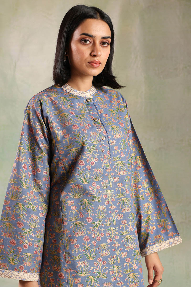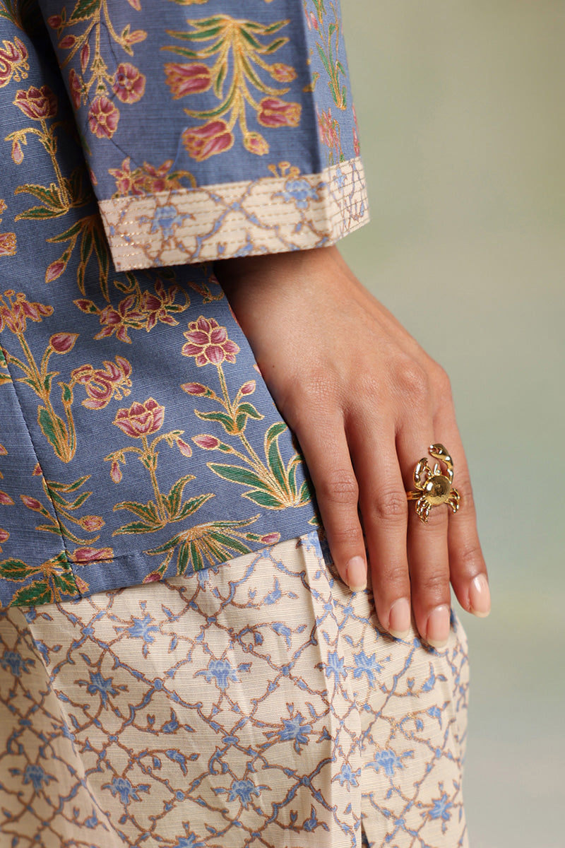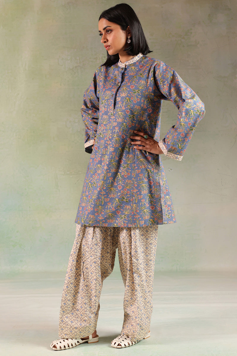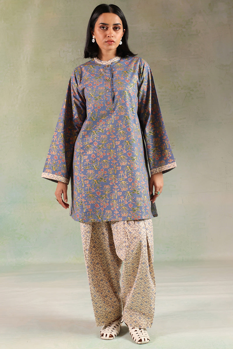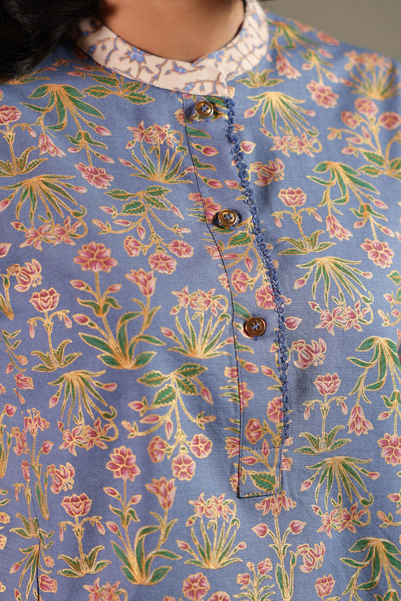 A classic-fit gold-printed paneled shirt with a low band neckline and buttoned front placket, adorned with delicate embroidery. Paired with a complementary printed classic-fit shalwar.