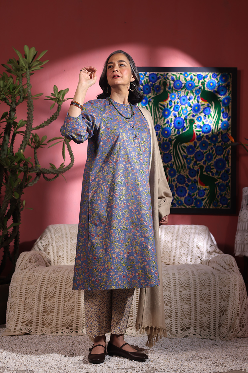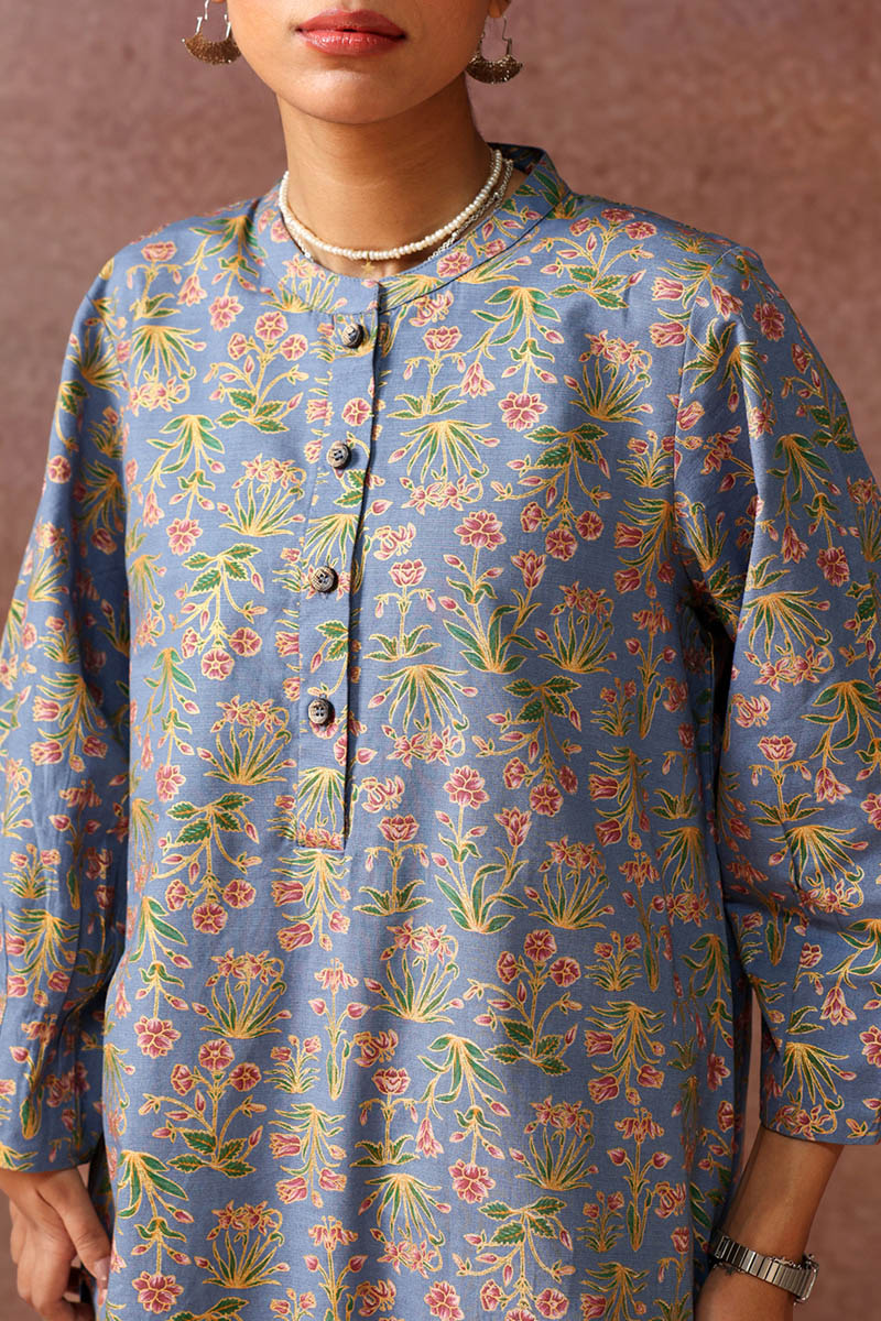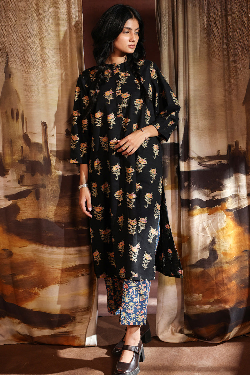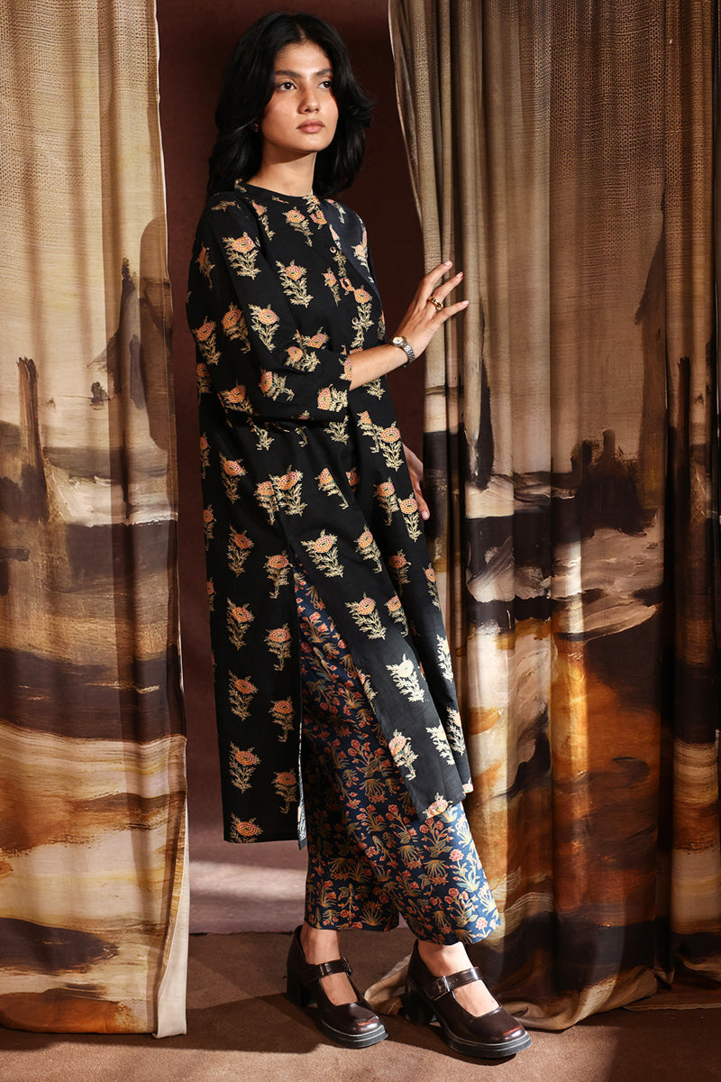 A classic-fit floral gold-printed shirt with a low band neckline and buttoned front placket, featuring a round hem. Paired with complementary straight-fit trousers.