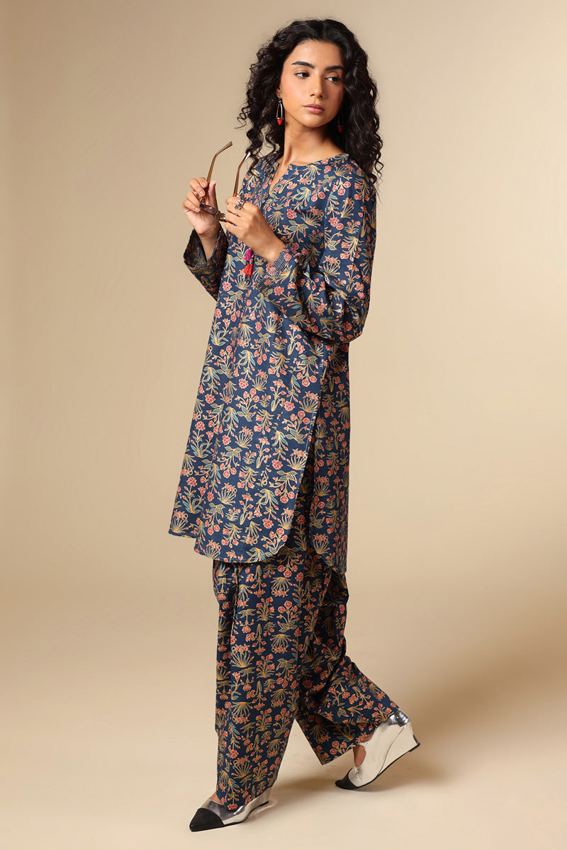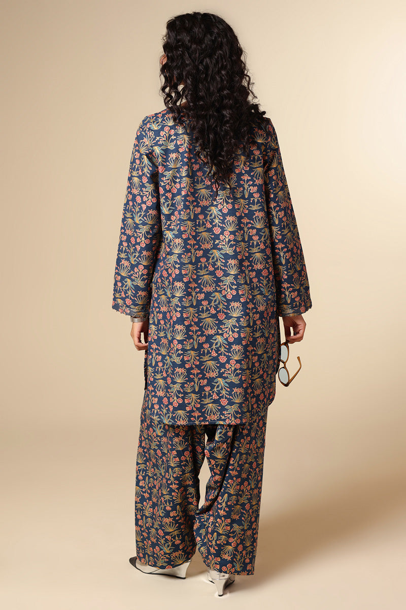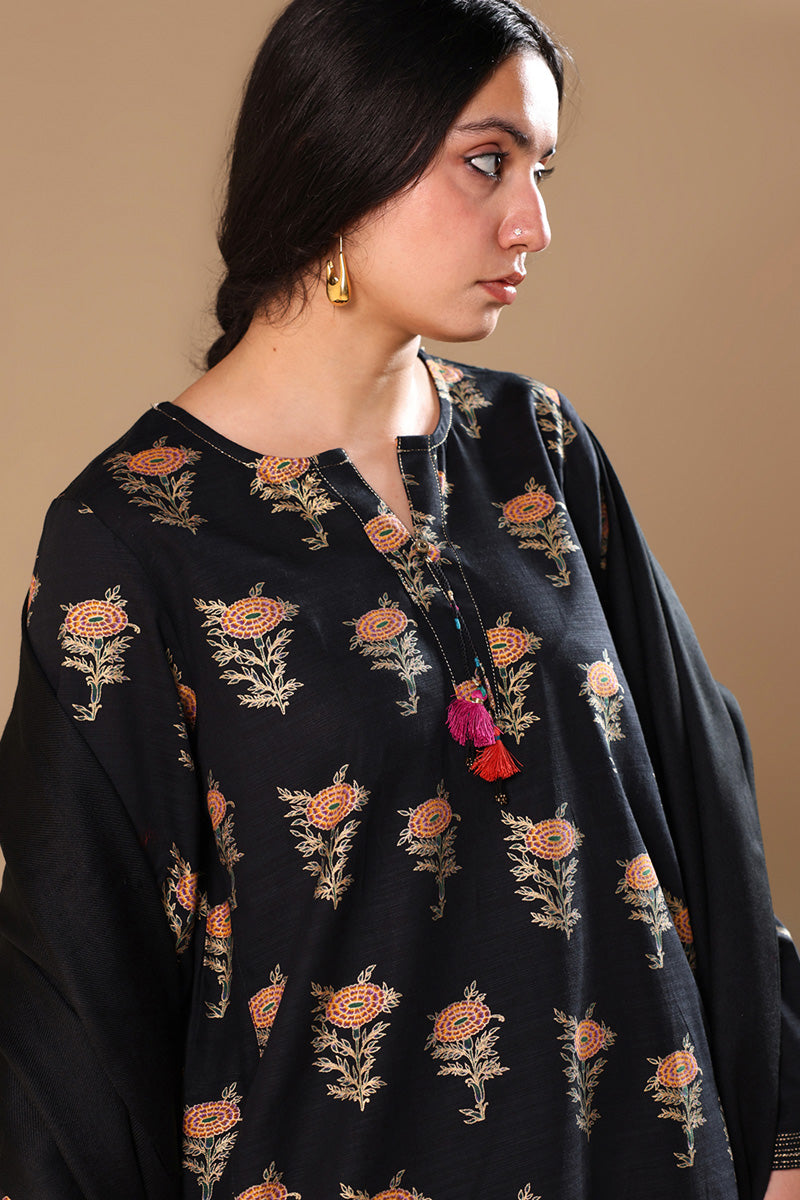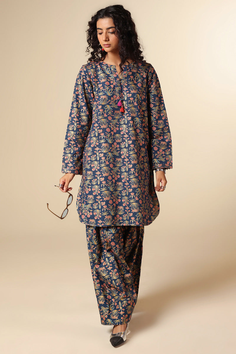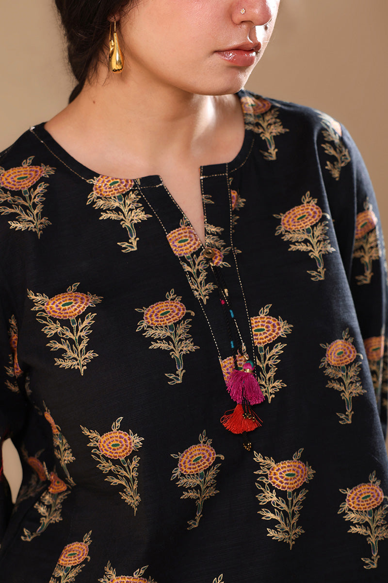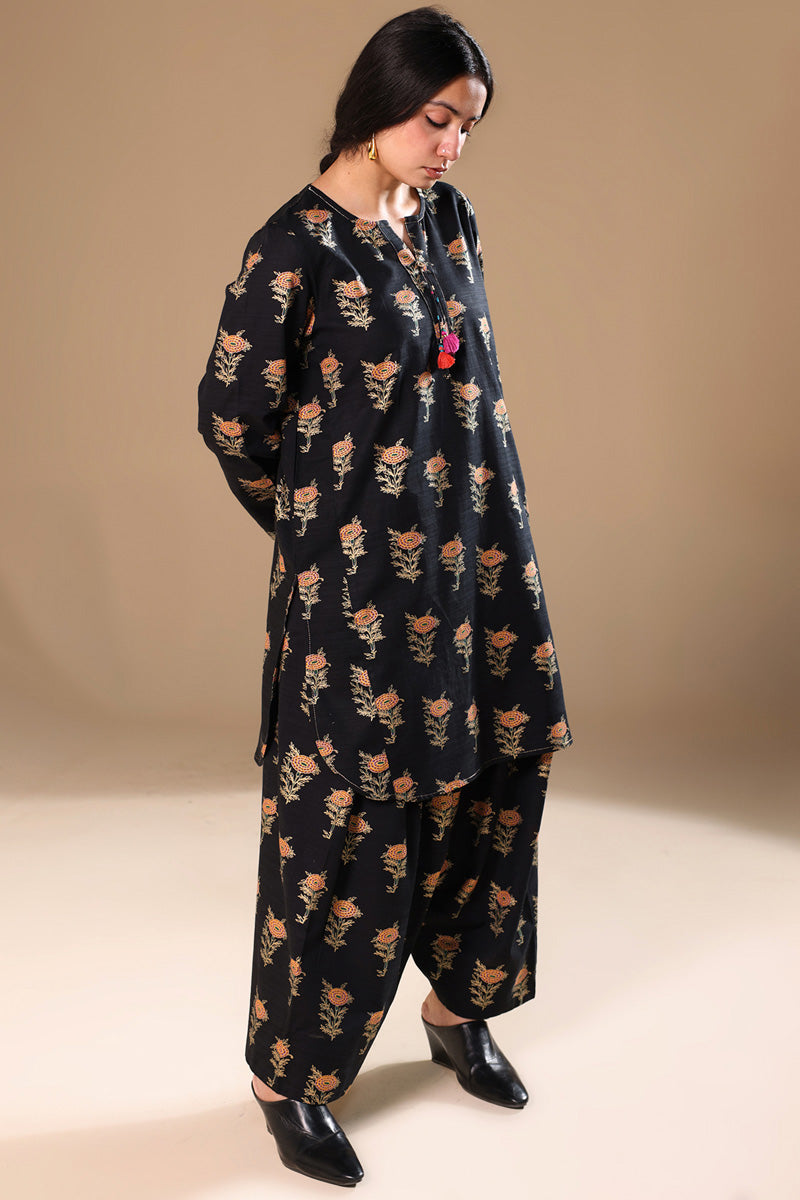 A classic-fit gold-printed shirt with a round neckline and V-slit, adorned with tassel detailing and bead accents on the sleeve hems. Finished with a round hem and paired with a matching printed classic shalwar.