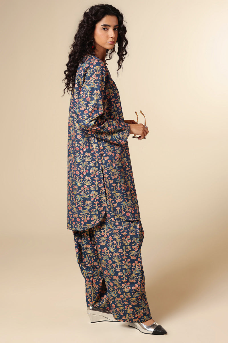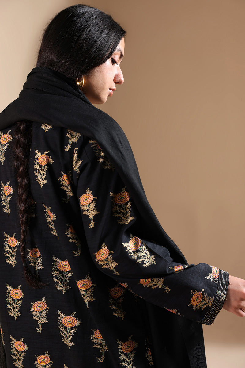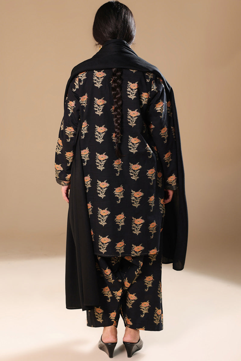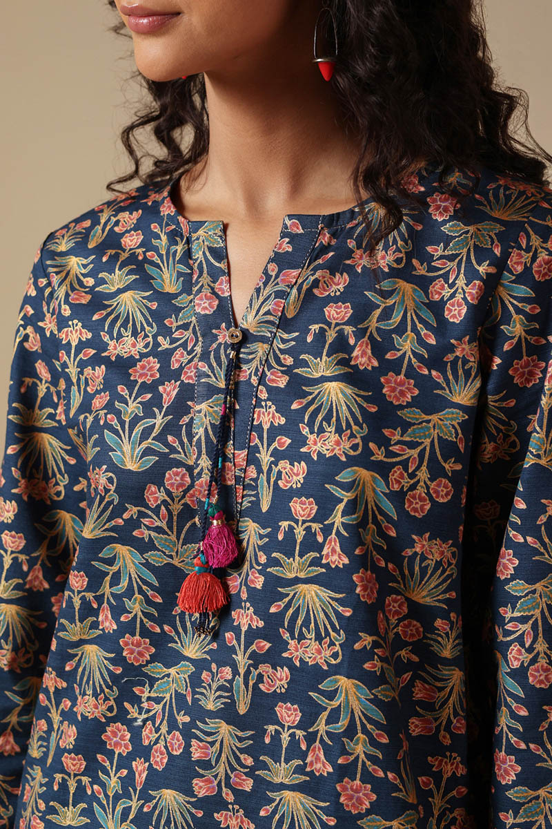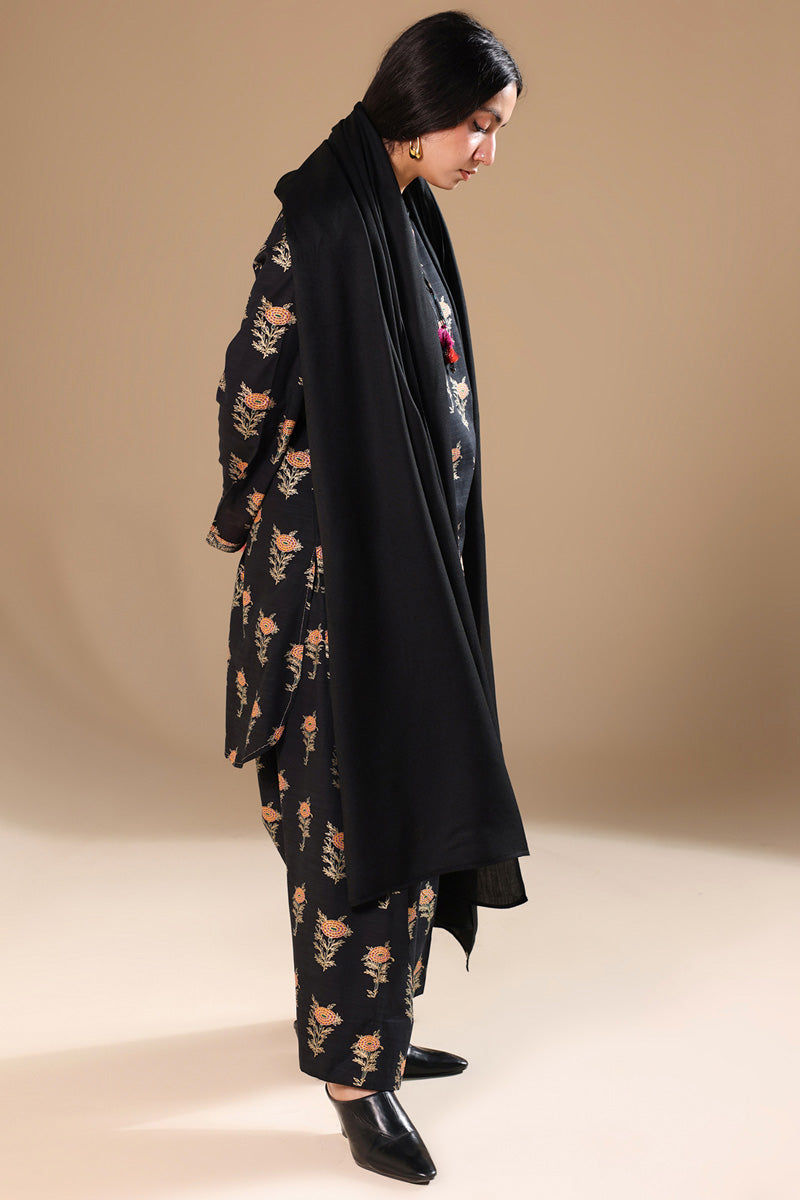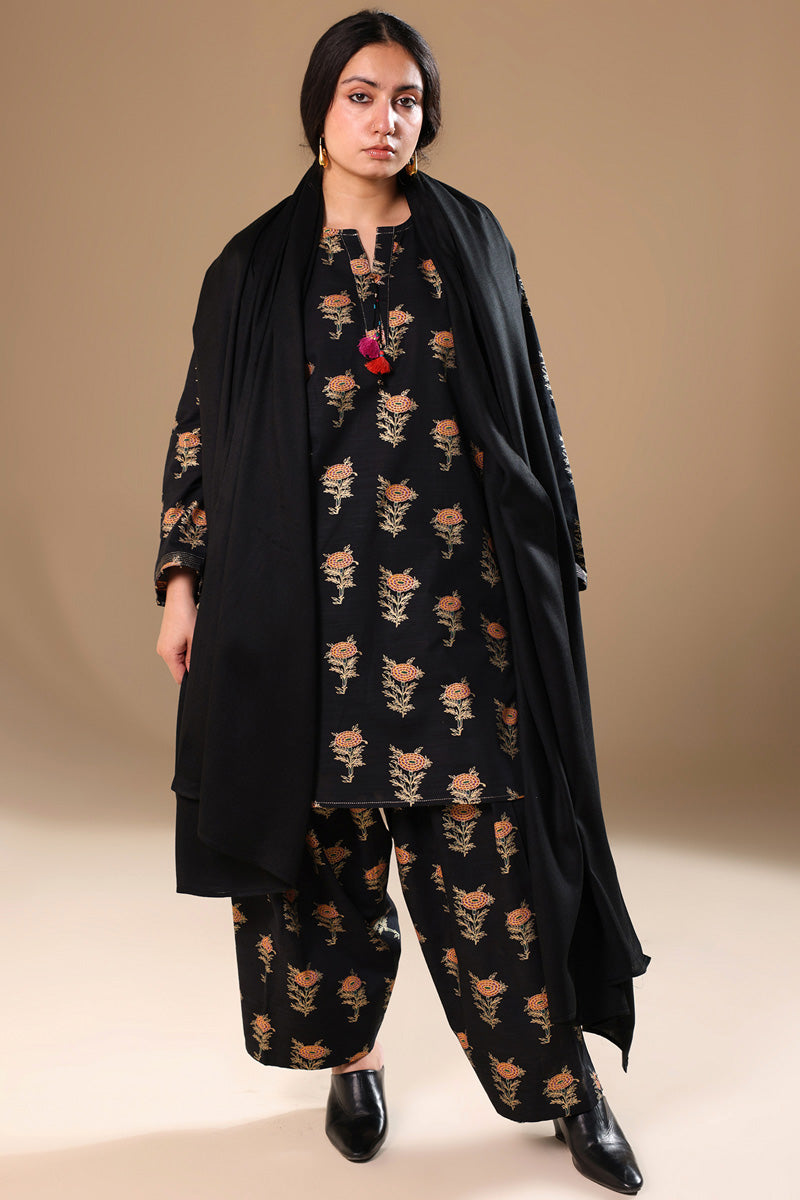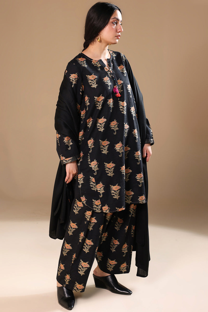 A classic-fit gold-printed shirt with a round neckline and V-slit, adorned with tassel detailing and bead accents on the sleeve hems. Finished with a round hem and paired with a matching printed classic shalwar.